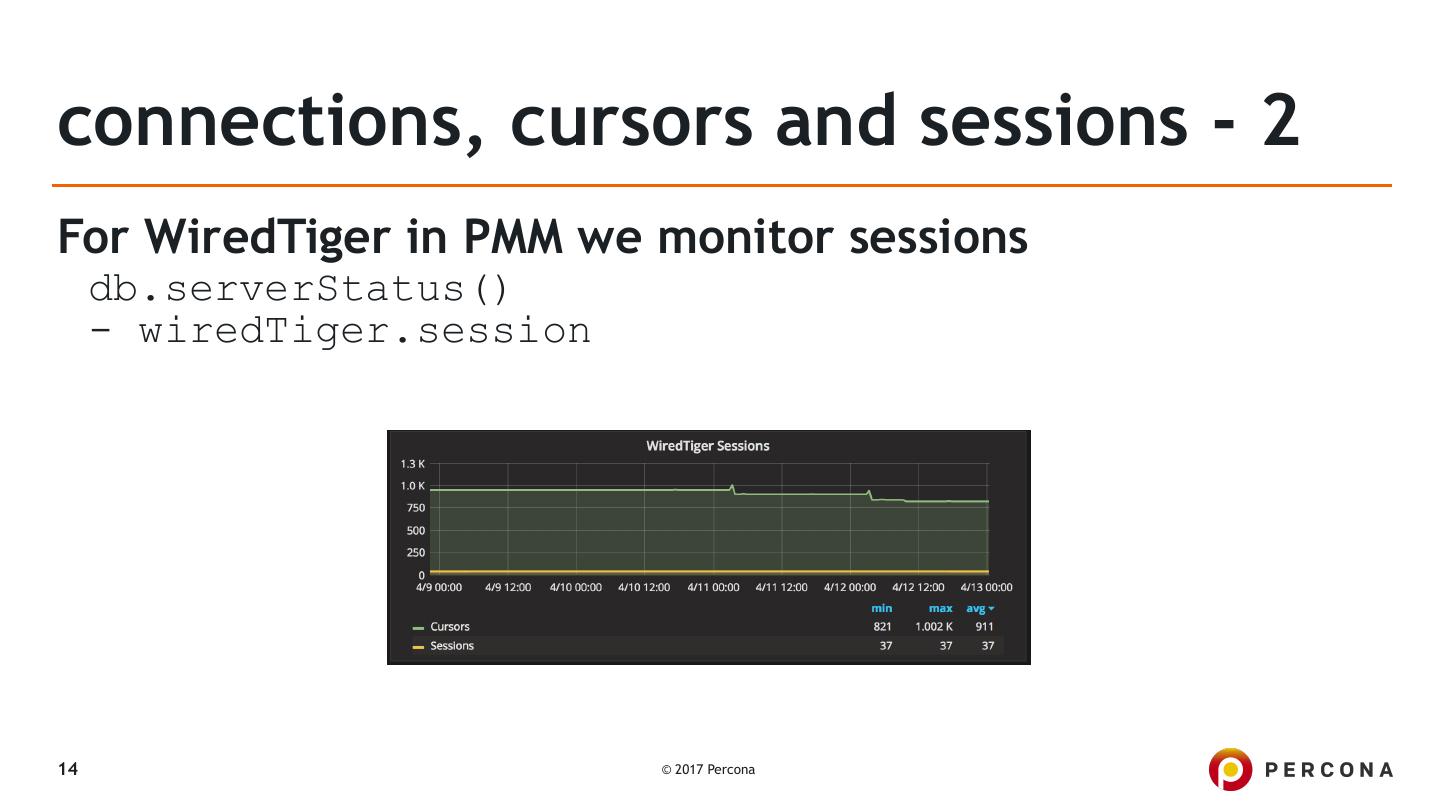 13 .connections, cursors and sessions - 1 ▪ Badly designed apps will create a new connection for every query ▪ Each connection has a 1MB overhead so this can add up quickly ▪ All major drivers provide connection pooling ▪ db.serverStatus() - globalLock.activeClients - connections - metrics.cursor 13 © 2017 Percona