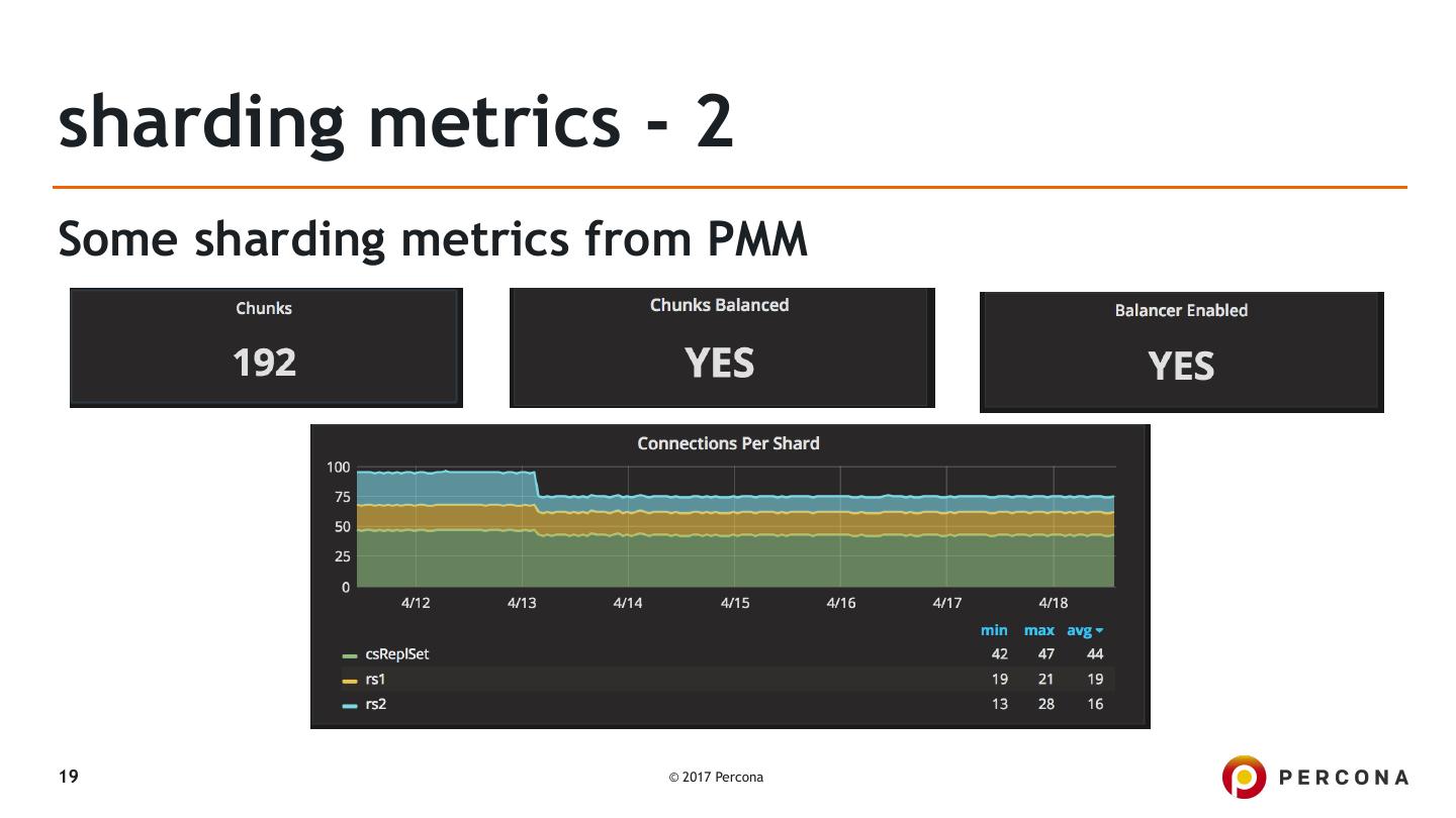 18 .sharding metrics - 1 Run against a mongos instance ▪ sh.status() This returns a report rather than JSON so you may have to do additional parsing or opt for >use config and run queries against the chunks, collections and shards collections to access the metrics you want Balancer commands ▪ - sh.getBalancerState() - sh.isBalancerRunning() 18 © 2017 Percona
