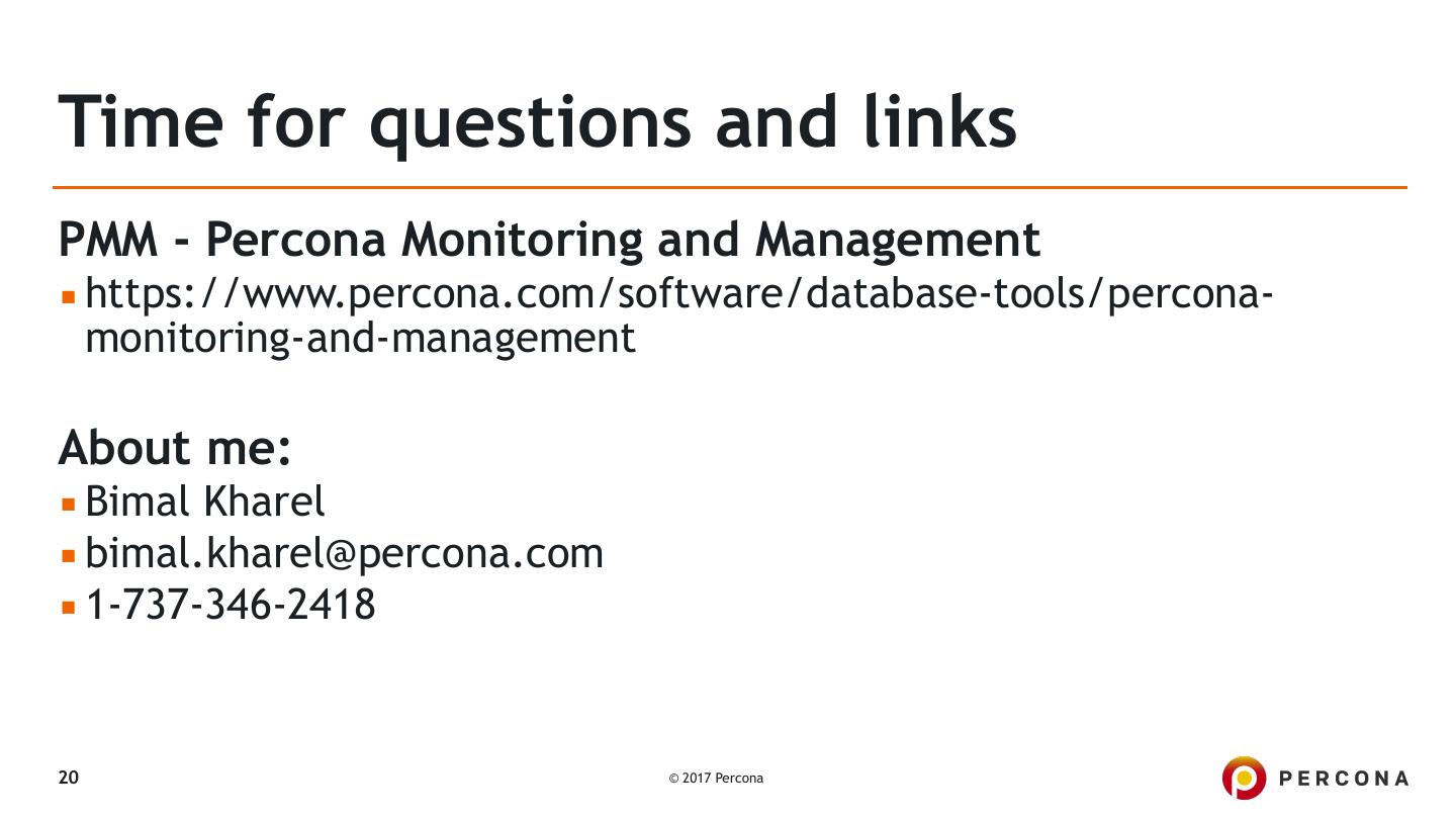 20 .Time for questions and links PMM - Percona Monitoring and Management ▪ https://www.percona.com/software/database-tools/percona- monitoring-and-management About me: ▪ Bimal Kharel ▪ bimal.kharel@percona.com ▪ 1-737-346-2418 20 © 2017 Percona
