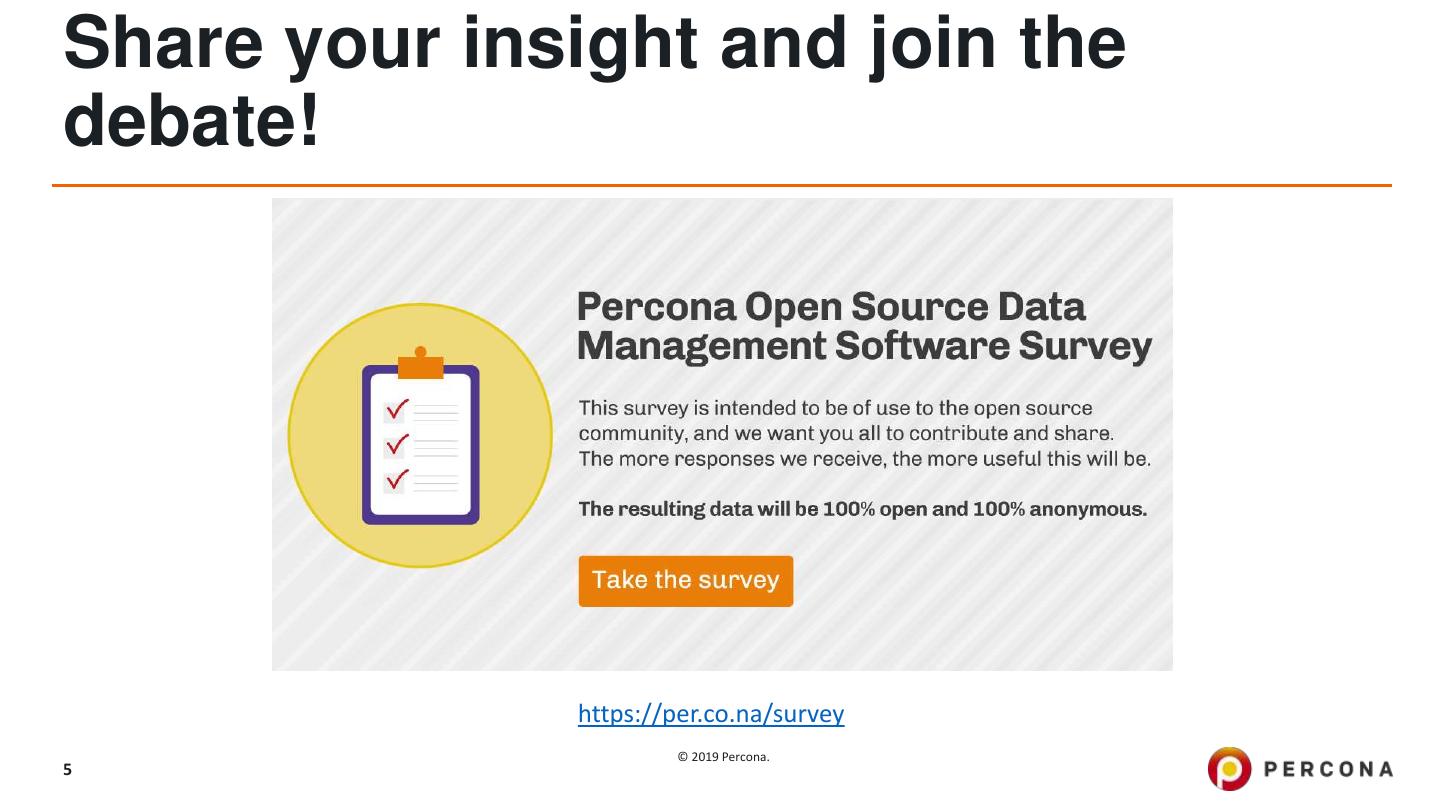 5 .Share your insight and join the debate! https://per.co.na/survey © 2019 Percona. 5