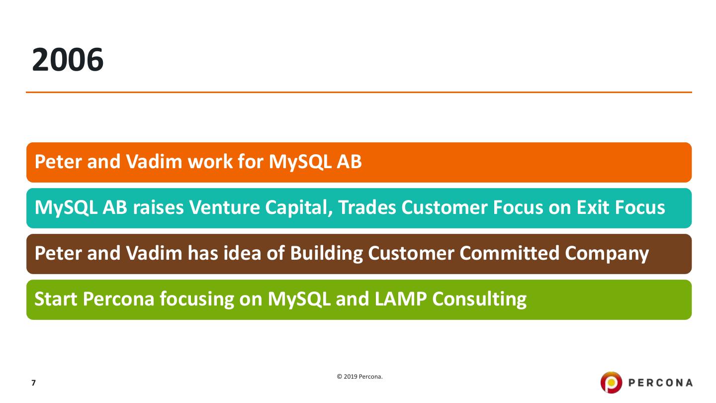 7 .2006 Peter and Vadim work for MySQL AB MySQL AB raises Venture Capital, Trades Customer Focus on Exit Focus Peter and Vadim has idea of Building Customer Committed Company Start Percona focusing on MySQL and LAMP Consulting © 2019 Percona. 7