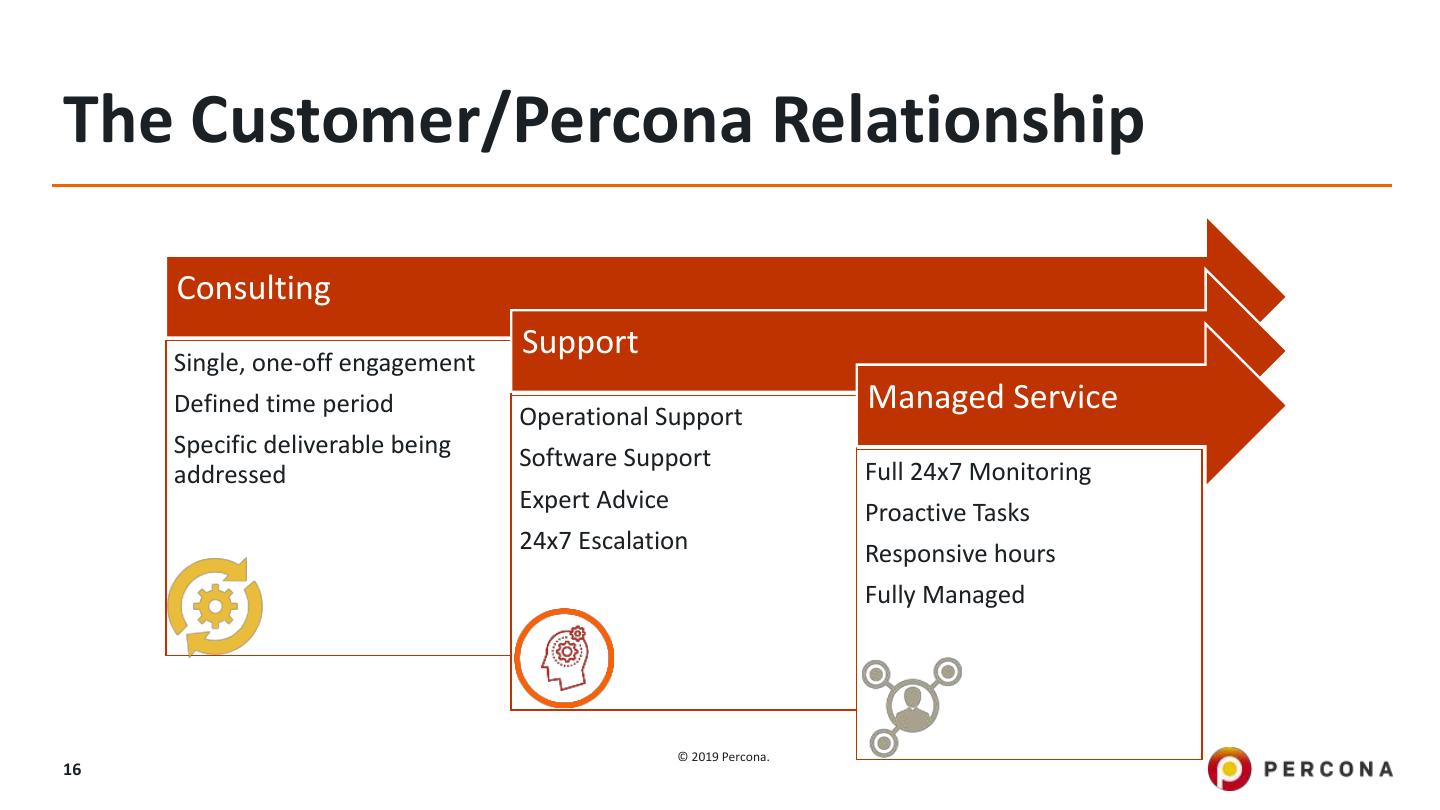 16 .The Customer/Percona Relationship Consulting Single, one-off engagement Support Defined time period Operational Support Managed Service Specific deliverable being Software Support addressed Full 24x7 Monitoring Expert Advice Proactive Tasks 24x7 Escalation Responsive hours Fully Managed © 2019 Percona. 16