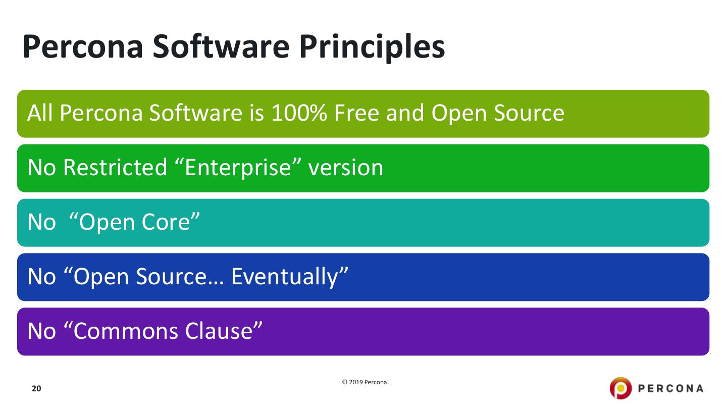 20 .Percona Software Principles All Percona Software is 100% Free and Open Source No Restricted “Enterprise” version No “Open Core” No “Open Source… Eventually” No “Commons Clause” © 2019 Percona. 20
