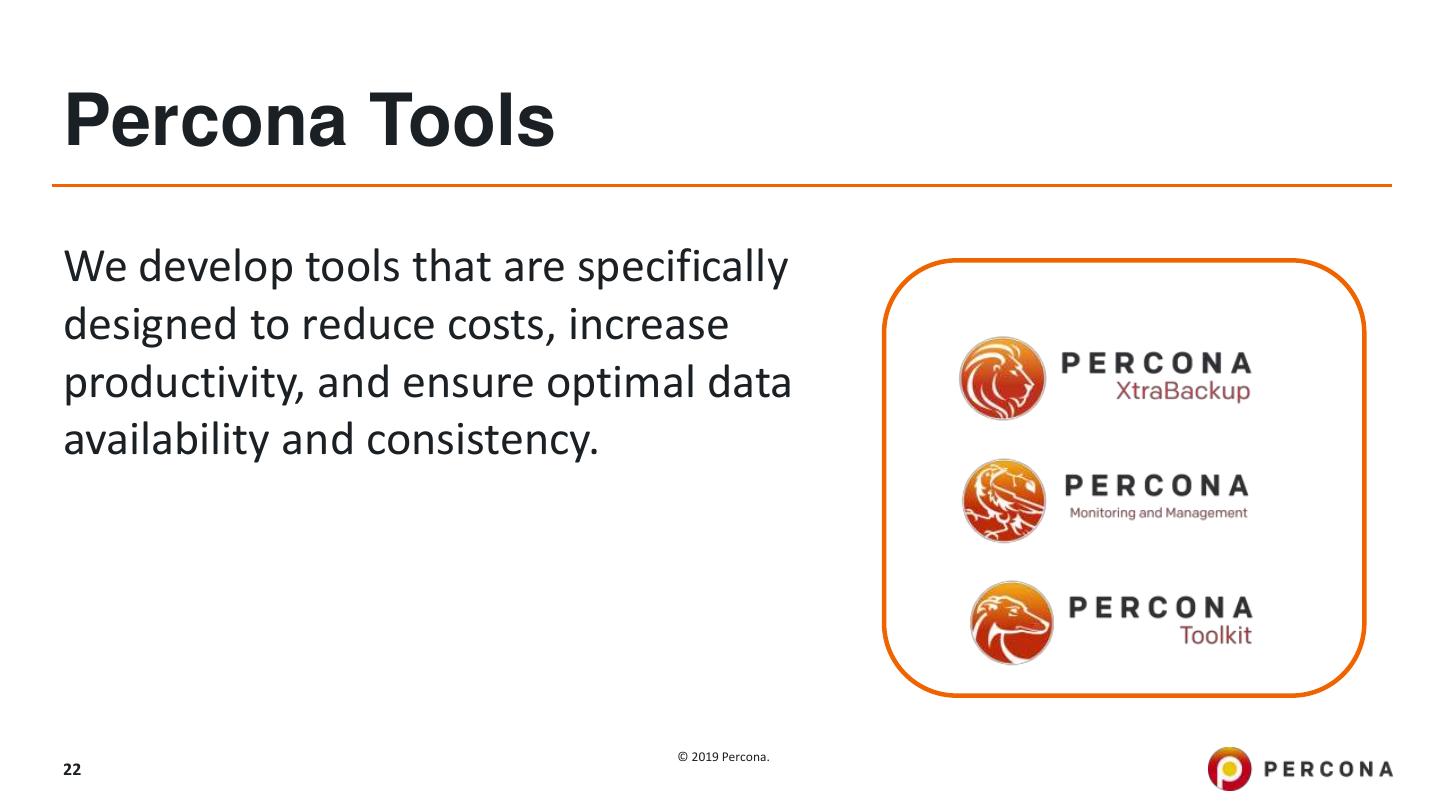 22 .Percona Tools We develop tools that are specifically designed to reduce costs, increase productivity, and ensure optimal data availability and consistency. © 2019 Percona. 22