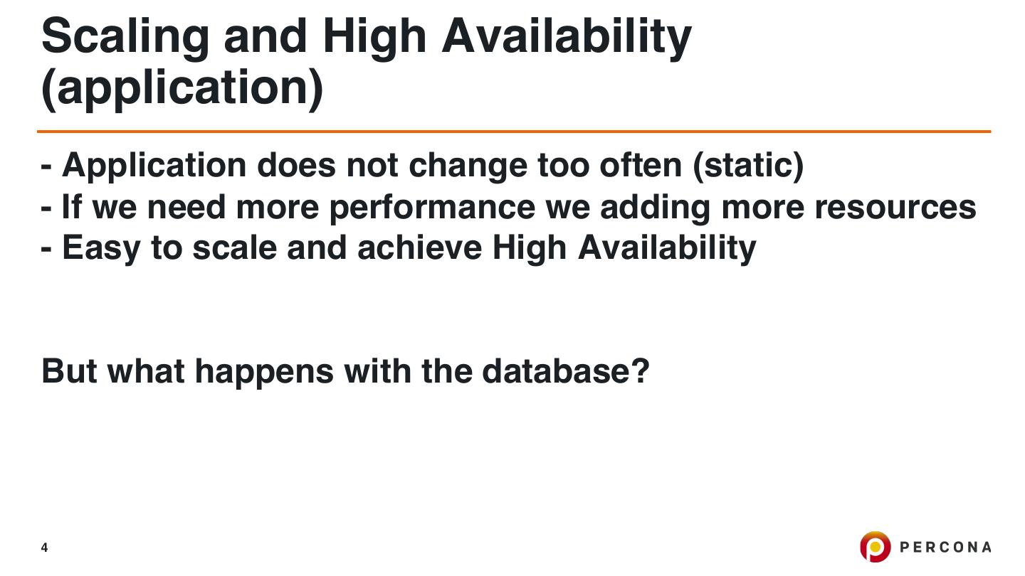 4 .Scaling and High Availability (application) - Application does not change too often (static) - If we need more performance we adding more resources - Easy to scale and achieve High Availability But what happens with the database? 4