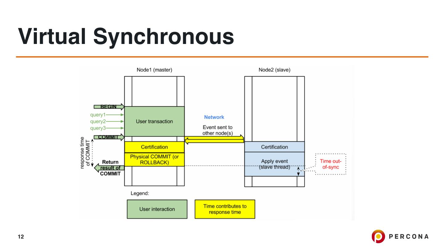 11 .Virtual Synchronous - "synchronous" guarantees that if changes happened on one node of the cluster, they happened on other nodes “synchronously" - It is always highly available (no data loss) - Data replicas are always consistent - Transactions can be executed on all nodes in parallel - No complex, time-consuming failovers 11