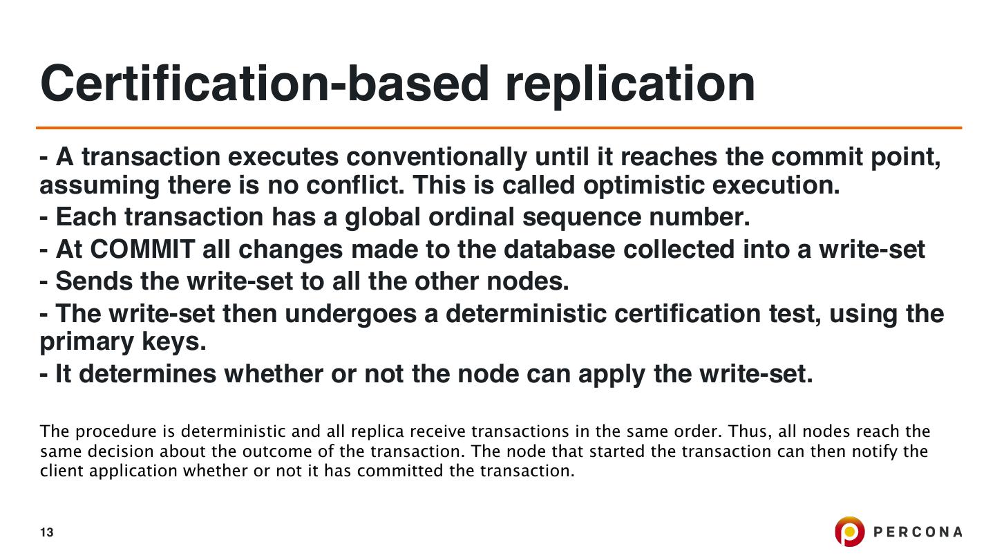 13 .Certification-based replication - A transaction executes conventionally until it reaches the commit point, assuming there is no conflict. This is called optimistic execution. - Each transaction has a global ordinal sequence number. - At COMMIT all changes made to the database collected into a write-set - Sends the write-set to all the other nodes. - The write-set then undergoes a deterministic certification test, using the primary keys. - It determines whether or not the node can apply the write-set. The procedure is deterministic and all replica receive transactions in the same order. Thus, all nodes reach the same decision about the outcome of the transaction. The node that started the transaction can then notify the client application whether or not it has committed the transaction. 13
