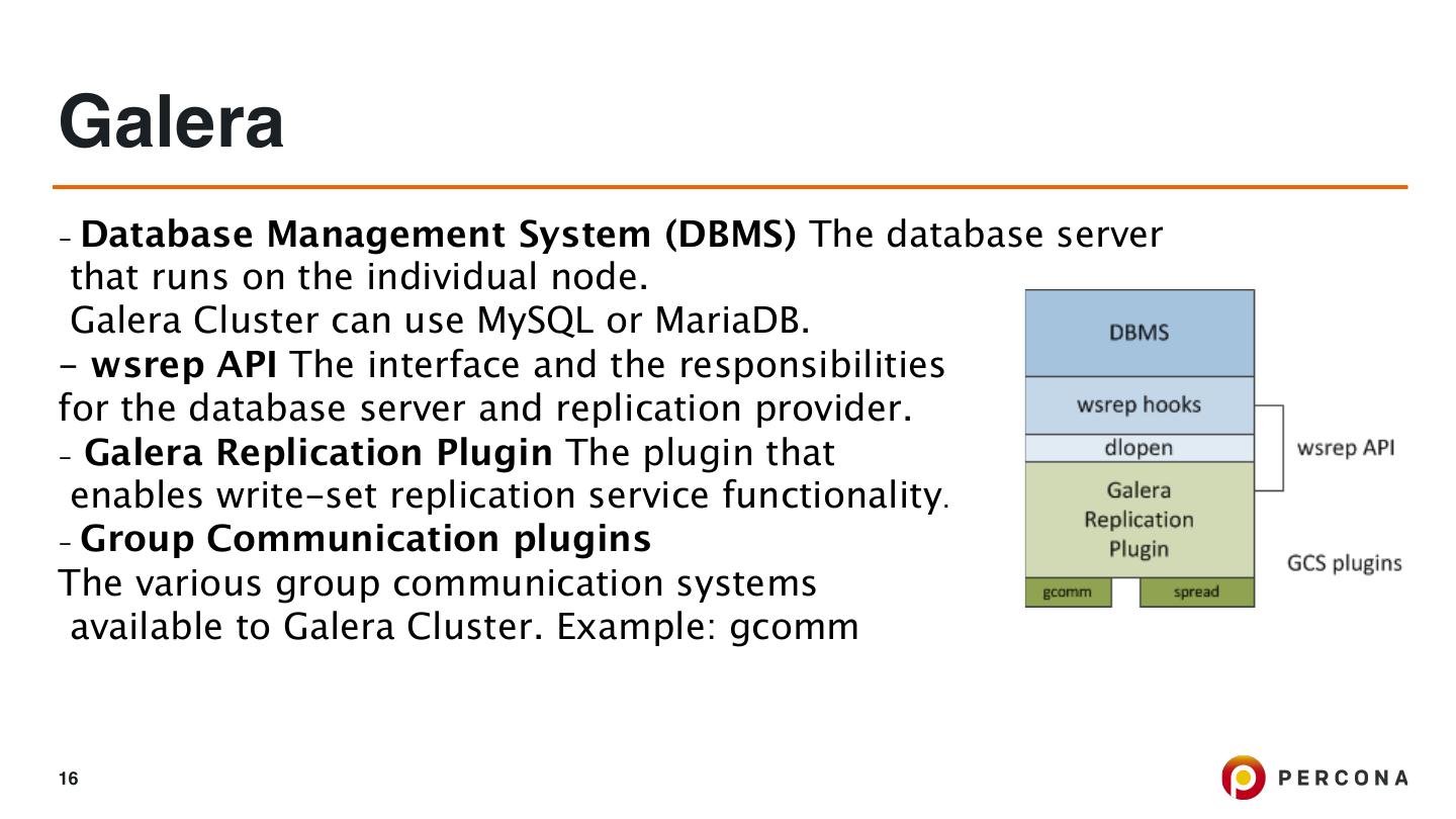 16 .Galera - Database Management System (DBMS) The database server that runs on the individual node. Galera Cluster can use MySQL or MariaDB. - wsrep API The interface and the responsibilities for the database server and replication provider. - Galera Replication Plugin The plugin that enables write-set replication service functionality. - Group Communication plugins The various group communication systems available to Galera Cluster. Example: gcomm 16