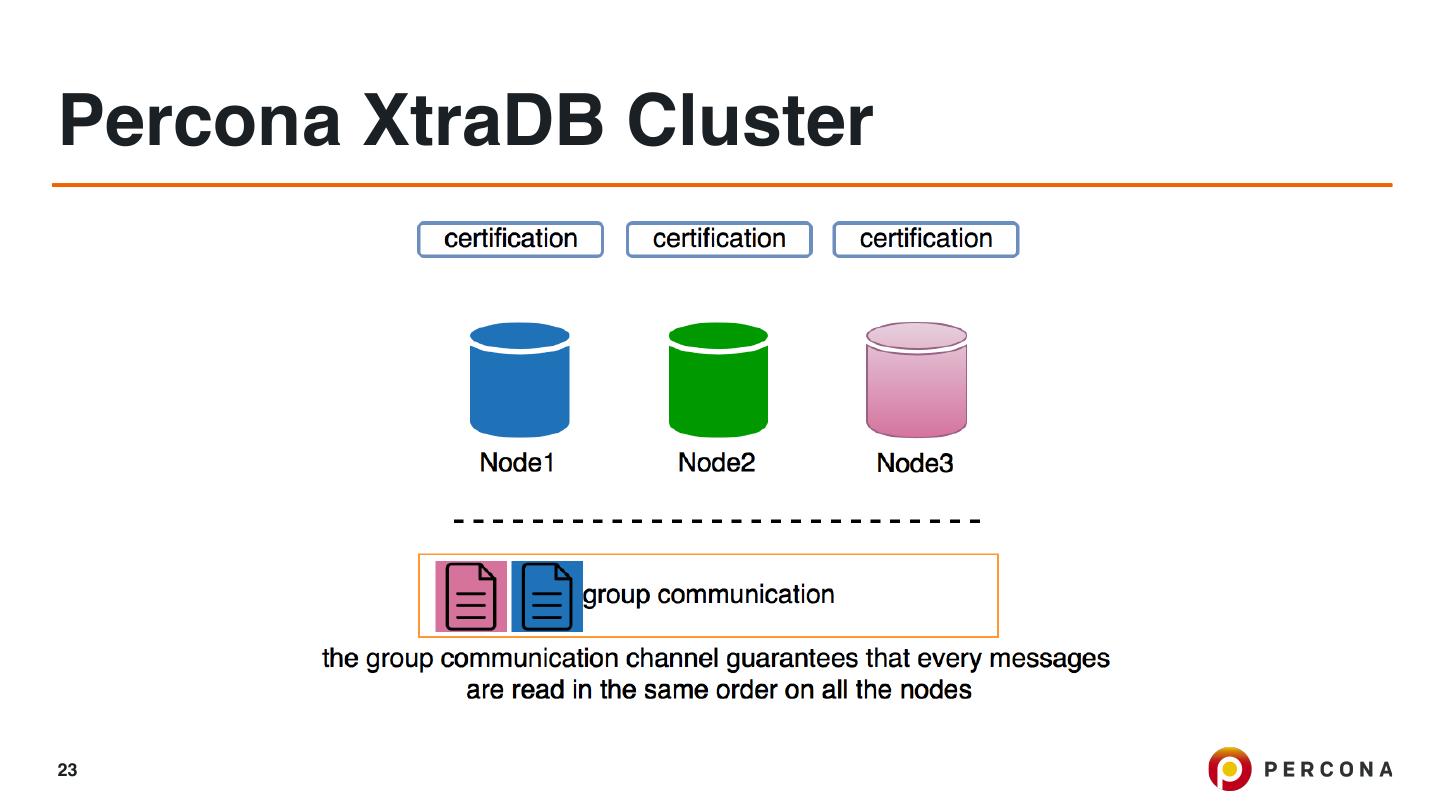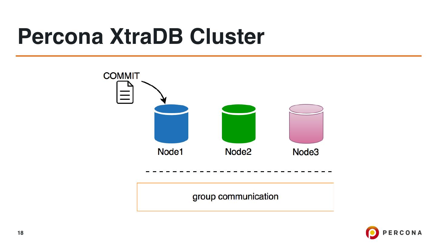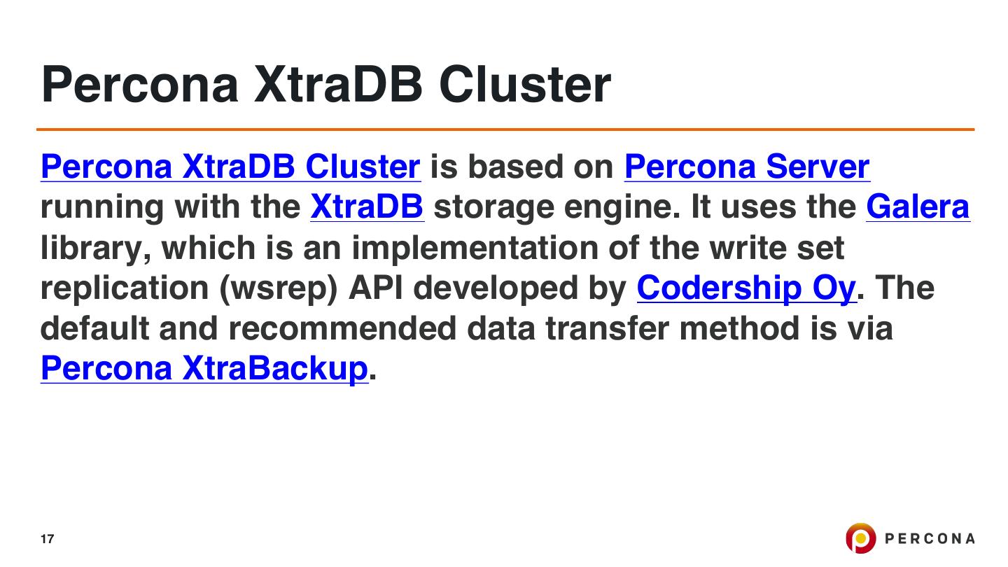 17 .Percona XtraDB Cluster Percona XtraDB Cluster is based on Percona Server running with the XtraDB storage engine. It uses the Galera library, which is an implementation of the write set replication (wsrep) API developed by Codership Oy. The default and recommended data transfer method is via Percona XtraBackup. 17