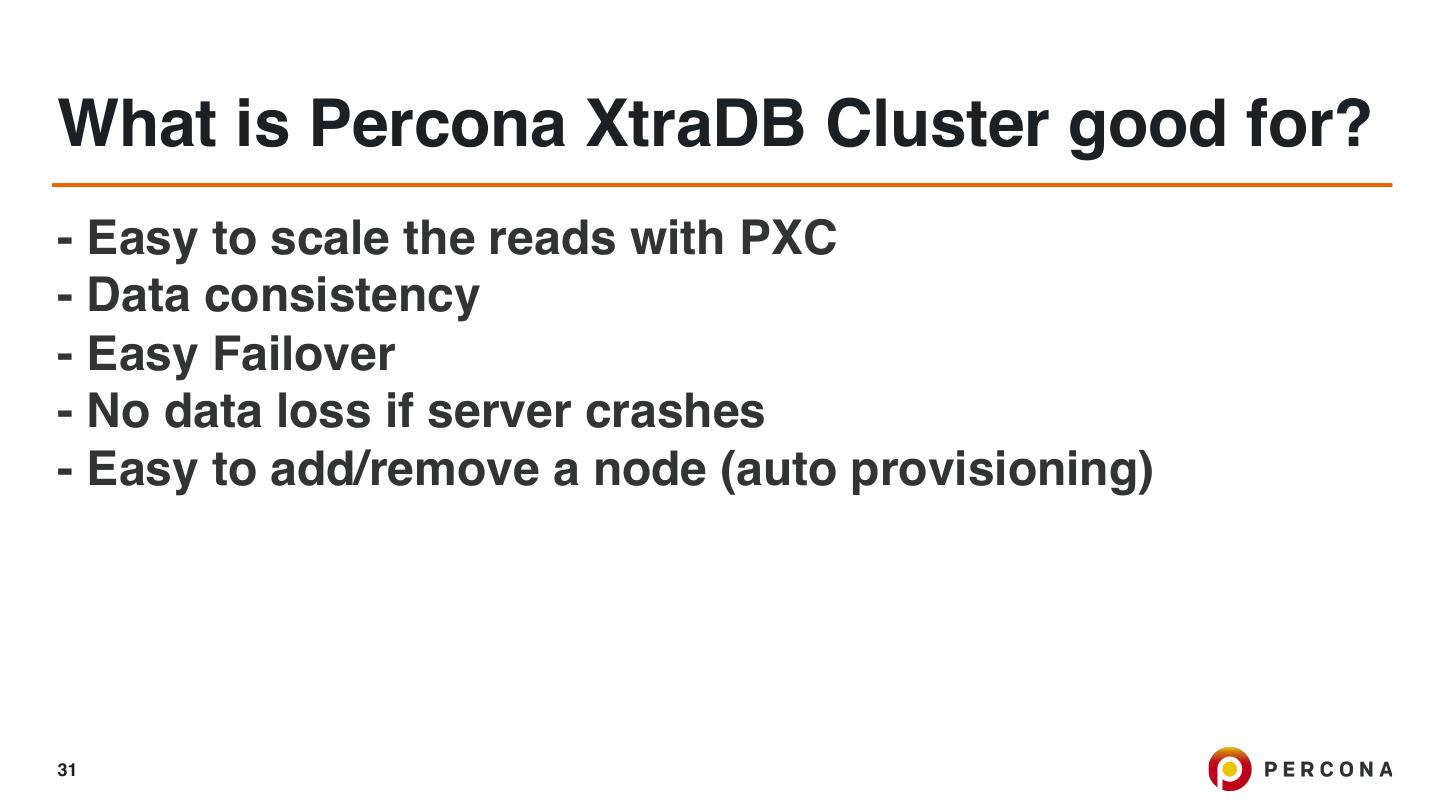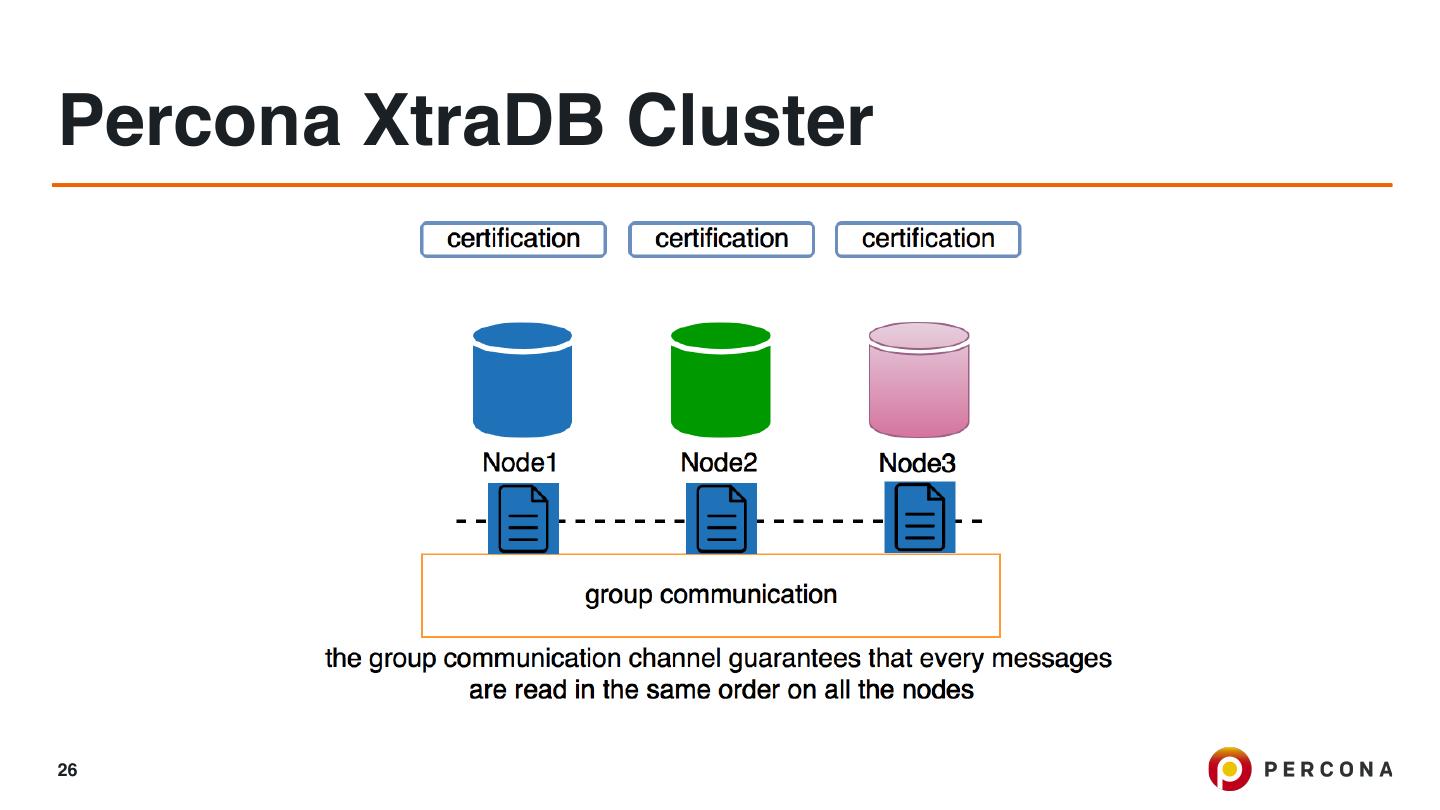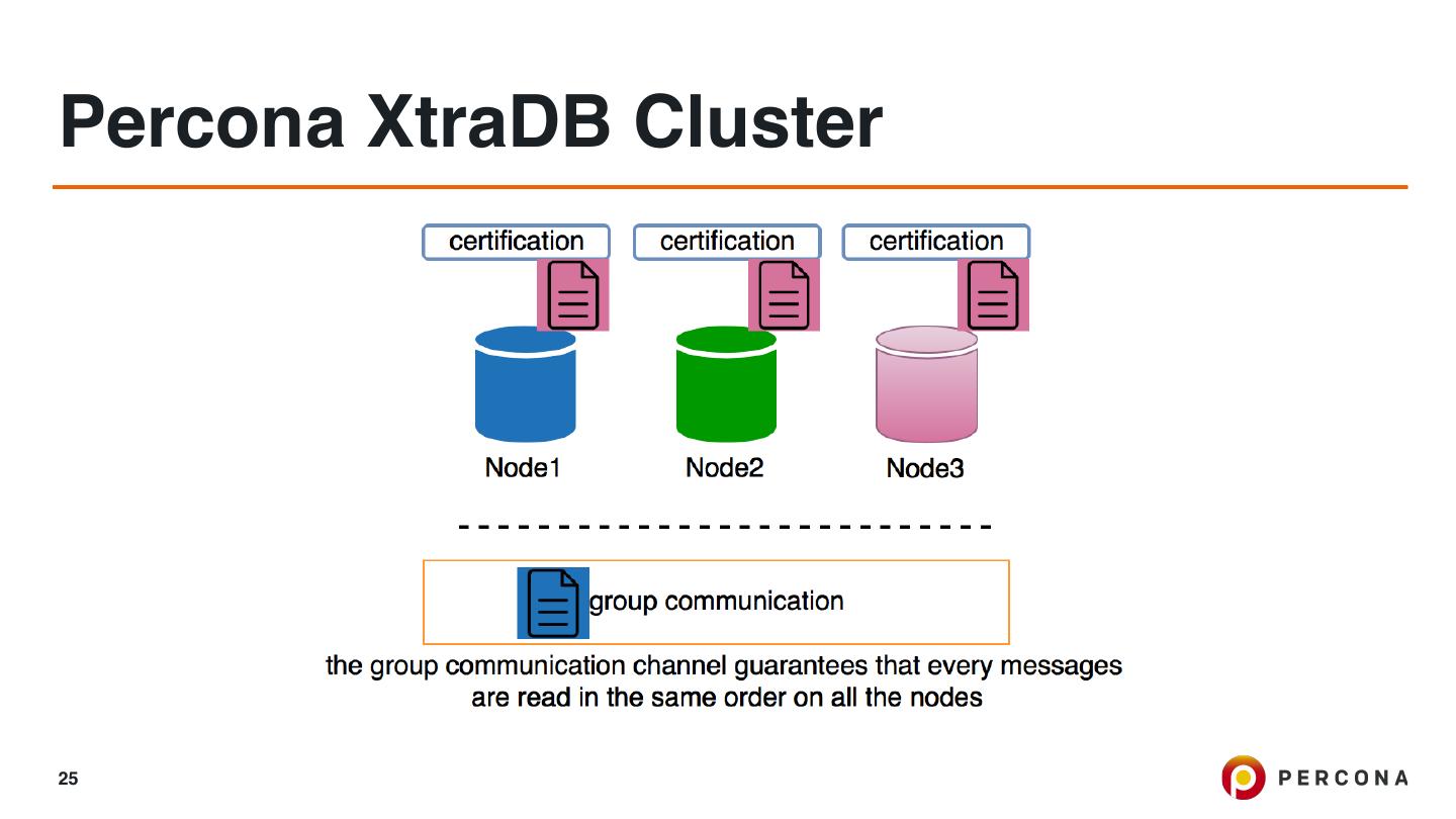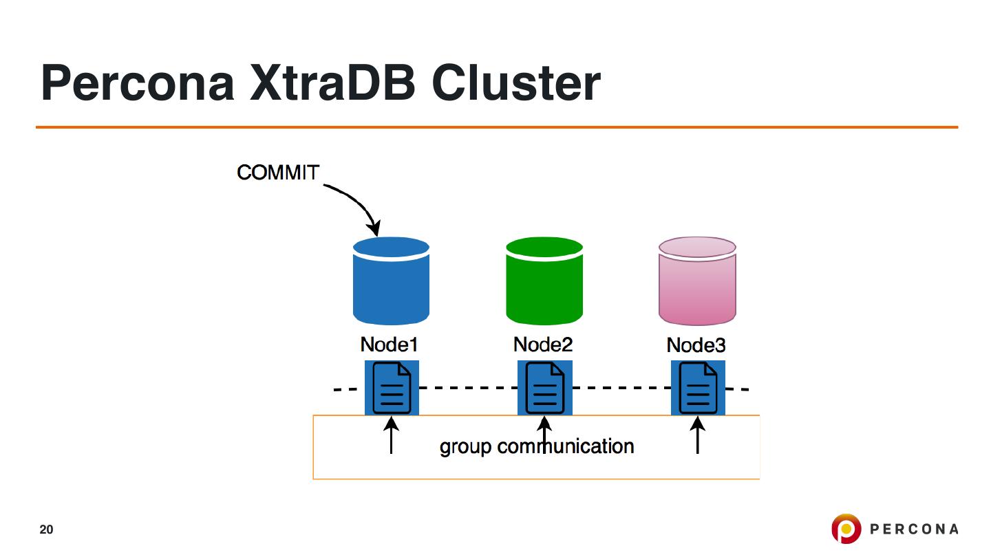 17 .Percona XtraDB Cluster Percona XtraDB Cluster is based on Percona Server running with the XtraDB storage engine. It uses the Galera library, which is an implementation of the write set replication (wsrep) API developed by Codership Oy. The default and recommended data transfer method is via Percona XtraBackup. 17
