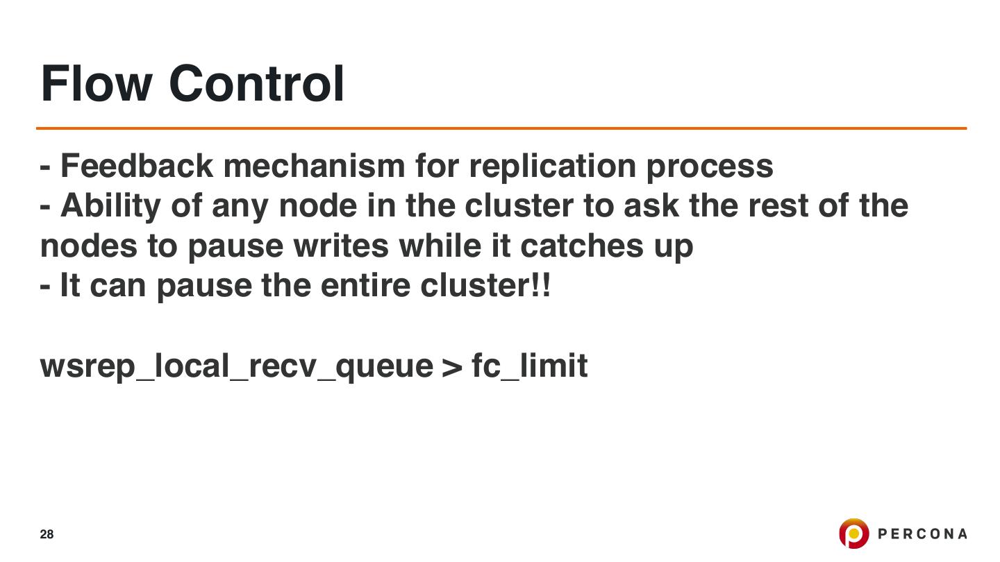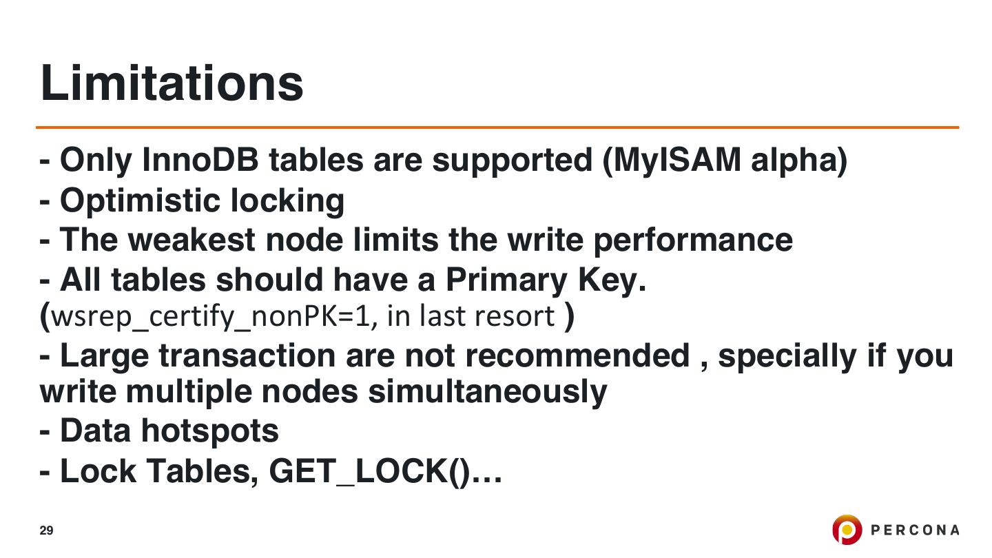28 .Flow Control - Feedback mechanism for replication process - Ability of any node in the cluster to ask the rest of the nodes to pause writes while it catches up - It can pause the entire cluster!! wsrep_local_recv_queue > fc_limit 28