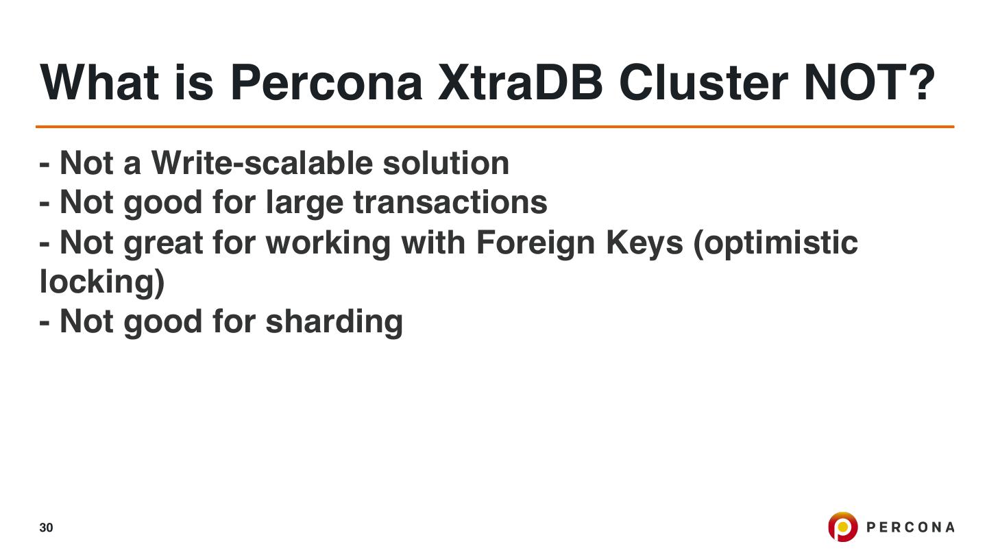 29 .Limitations - Only InnoDB tables are supported (MyISAM alpha) - Optimistic locking - The weakest node limits the write performance - All tables should have a Primary Key. (wsrep_certify_nonPK=1, in last resort ) - Large transaction are not recommended , specially if you write multiple nodes simultaneously - Data hotspots - Lock Tables, GET_LOCK()… 29