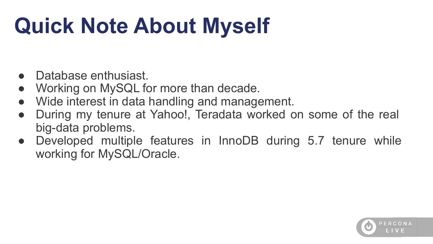 2 .Quick Note About Myself ● Database enthusiast. ● Working on MySQL for more than decade. ● Wide interest in data handling and management. ● During my tenure at Yahoo!, Teradata worked on some of the real big-data problems. ● Developed multiple features in InnoDB during 5.7 tenure while working for MySQL/Oracle.