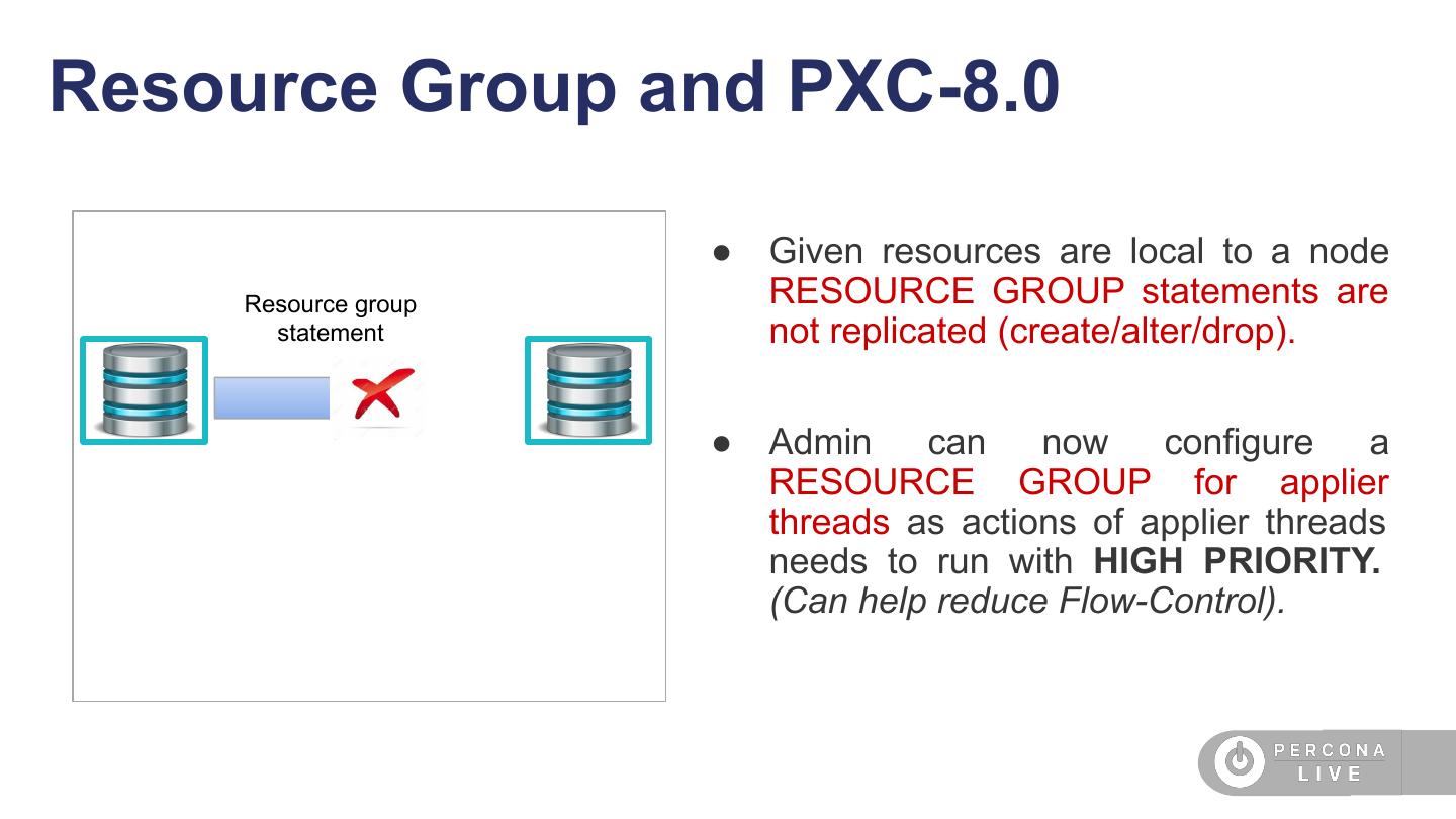 10 .Resource Group and PXC-8.0 ● Given resources are local to a node Resource group RESOURCE GROUP statements are statement not replicated (create/alter/drop). ● Admin can now configure a RESOURCE GROUP for applier threads as actions of applier threads needs to run with HIGH PRIORITY. (Can help reduce Flow-Control).