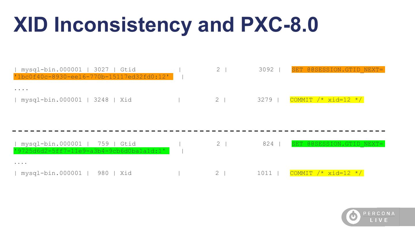24 .XID Inconsistency and PXC-8.0 | mysql-bin.000001 | 3027 | Gtid | 2 | 3092 | SET @@SESSION.GTID_NEXT= '1bc0f40c-8930-ee16-770b-15117ed32fd0:12' | .... | mysql-bin.000001 | 3248 | Xid | 2 | 3279 | COMMIT /* xid=12 */ | mysql-bin.000001 | 759 | Gtid | 2 | 824 | SET @@SESSION.GTID_NEXT= '9725d6d2-5ff7-11e9-a3b4-9cb6d0ba1a1d:1' | .... | mysql-bin.000001 | 980 | Xid | 2 | 1011 | COMMIT /* xid=12 */