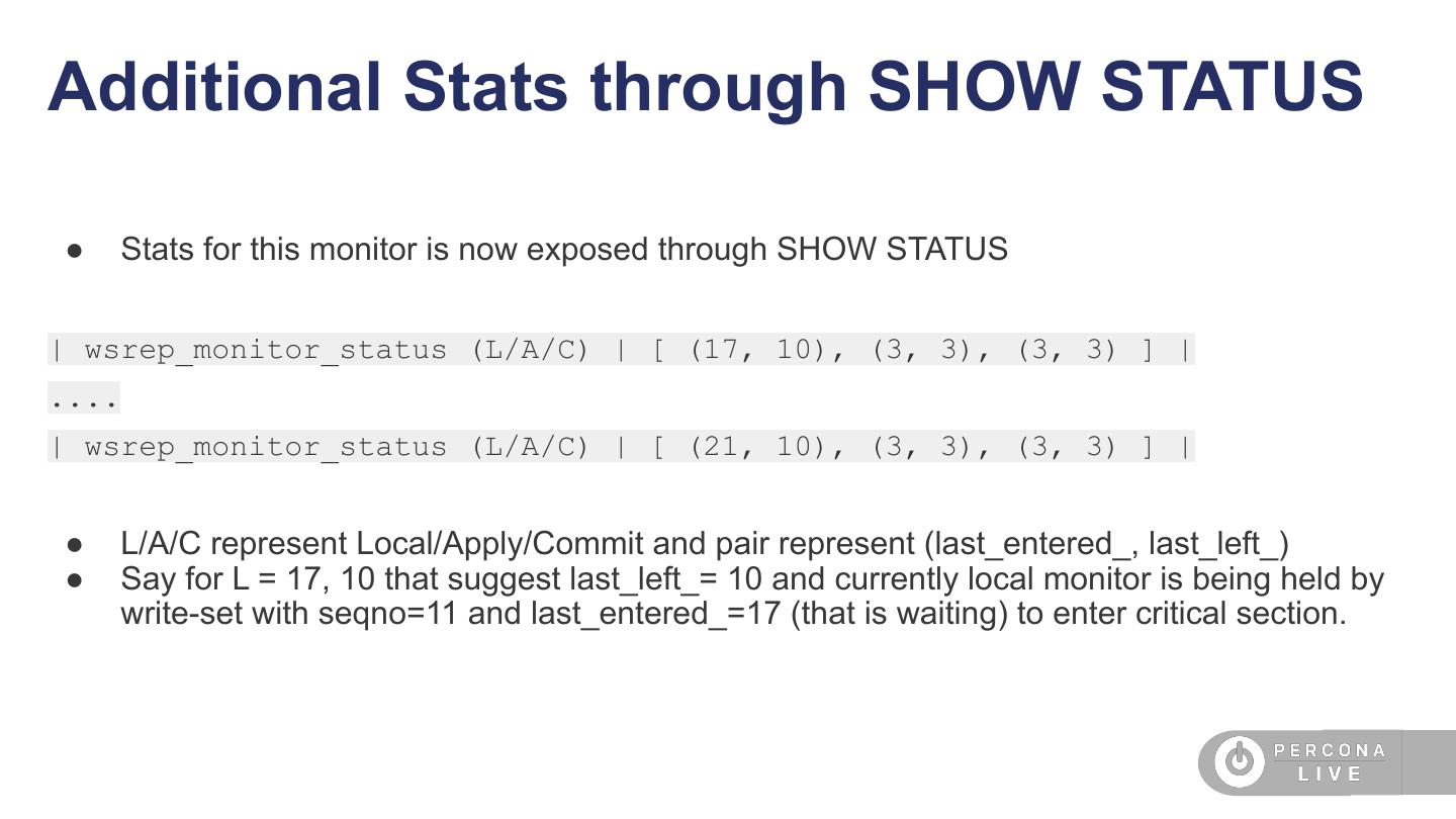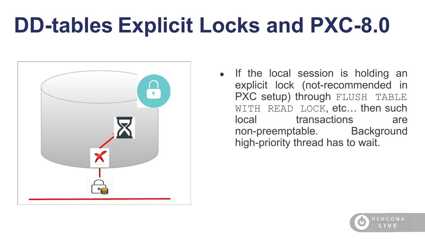 28 .DD-tables Explicit Locks and PXC-8.0 ● If the local session is holding an explicit lock (not-recommended in PXC setup) through FLUSH TABLE WITH READ LOCK, etc… then such local transactions are non-preemptable. Background high-priority thread has to wait.