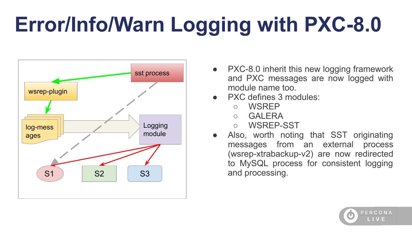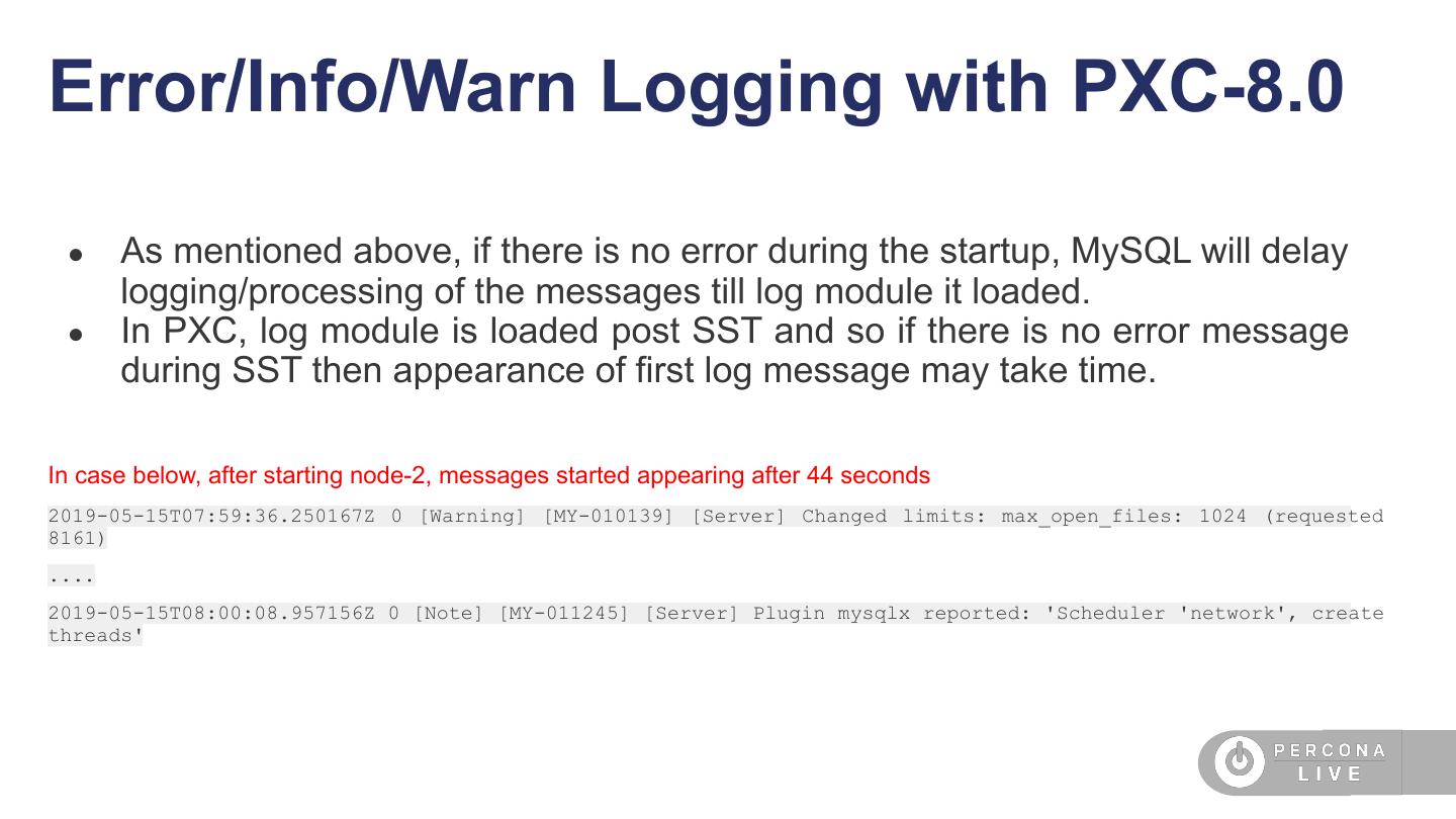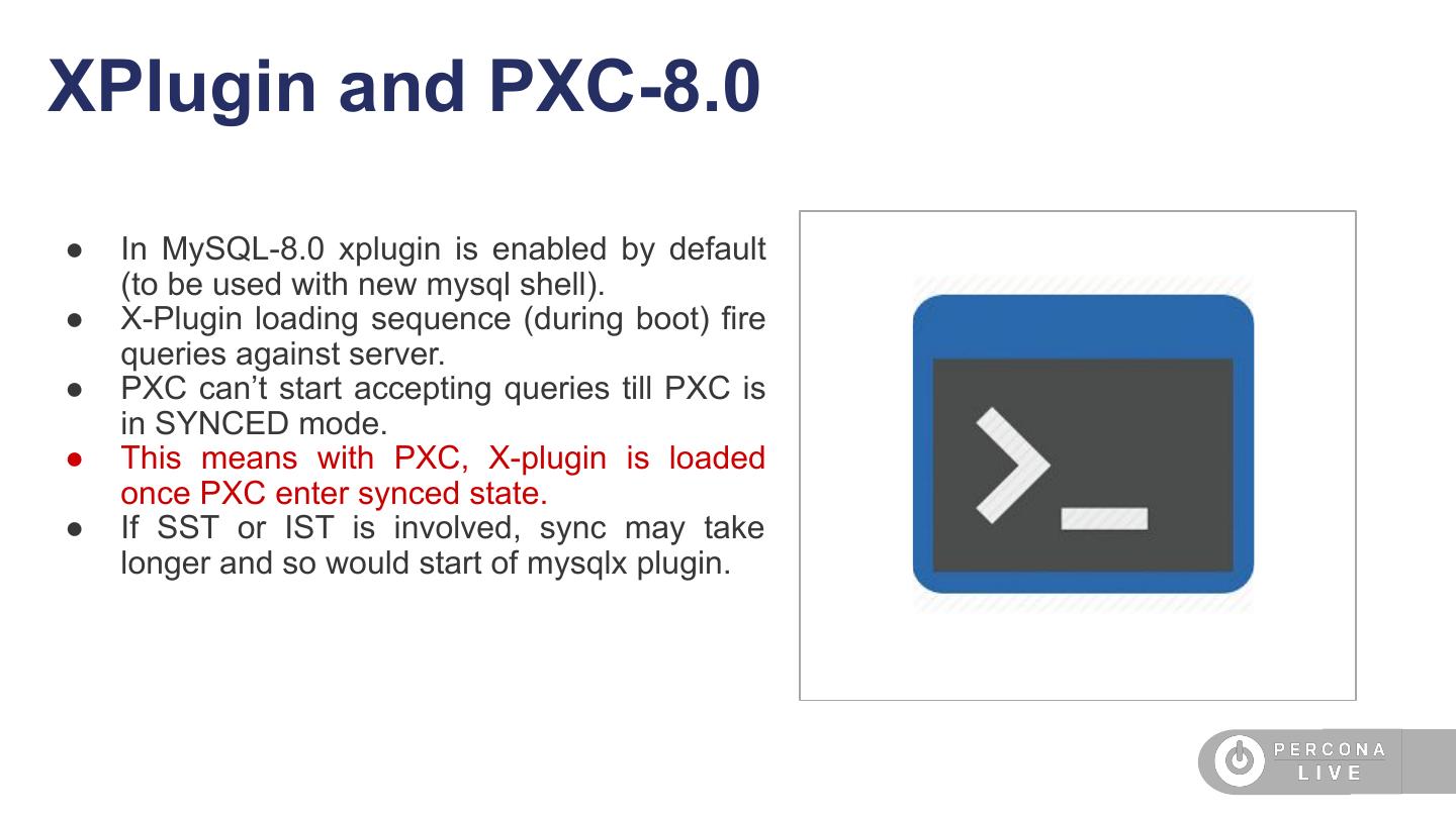 23 .XID Inconsistency and PXC-8.0 ● Now that DDL are transactional, MySQL assigns xid to each DDL statement. ● MySQL has its own logic to assign XID and PXC (wsrep) has its own logic to assign XID. ● With 2 sub-systems in place it can cause duplicate XID generation that can eventually cause problem with recovery (especially with new improved recovery logic of MySQL-8.0 that checks for unique XID).
