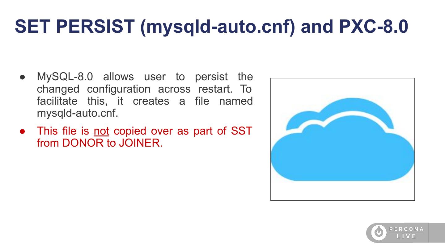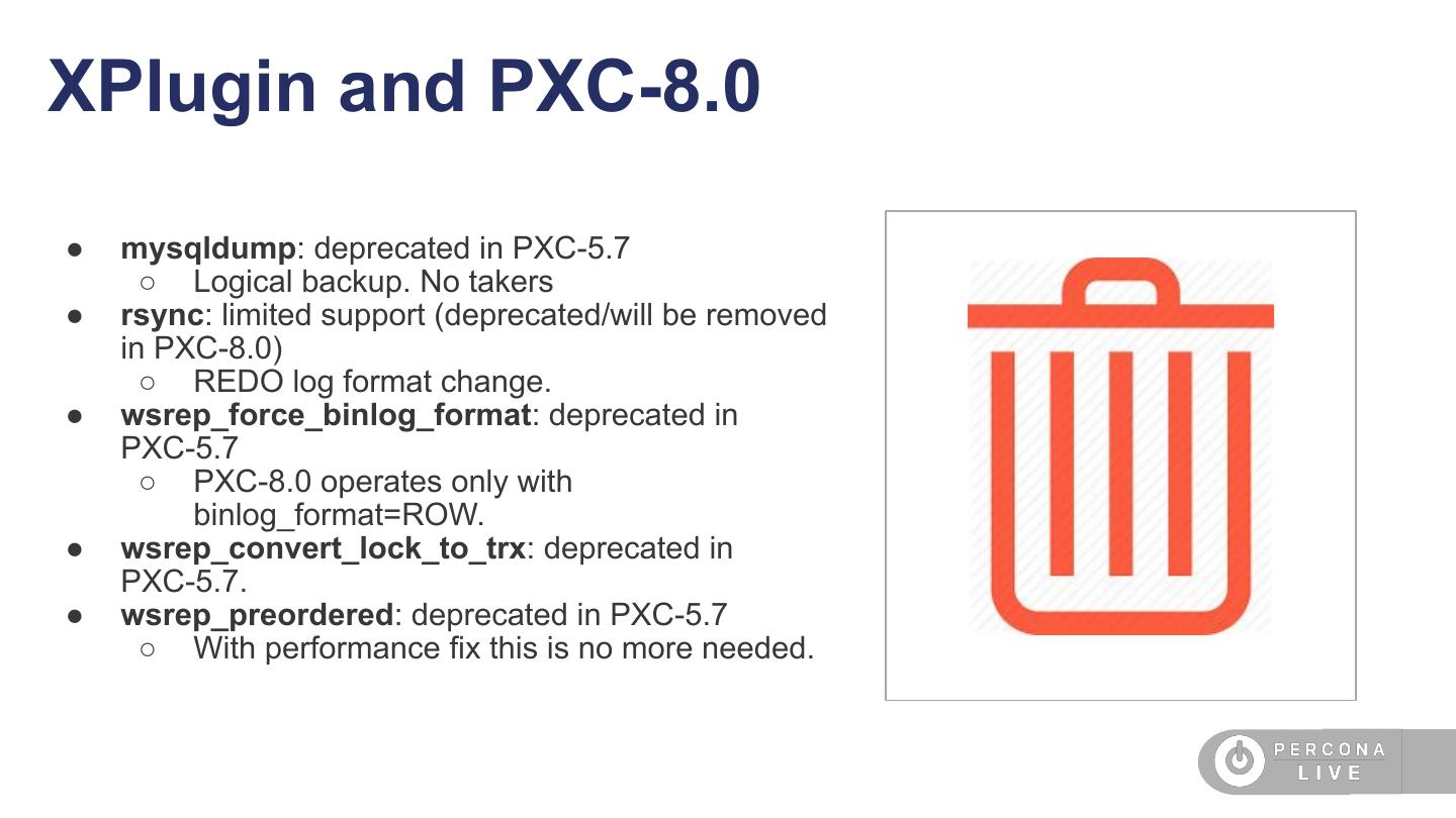 17 .Atomic DDL and PXC-8.0 ● Eventually, PXC plans to make use DDL of atomic nature of DDL and execute the DDL through write-set DDL DDL replication too. write-set replication ● This will also take-care of blocking DDL issue that exist due to TOI based execution. TOI/RSU