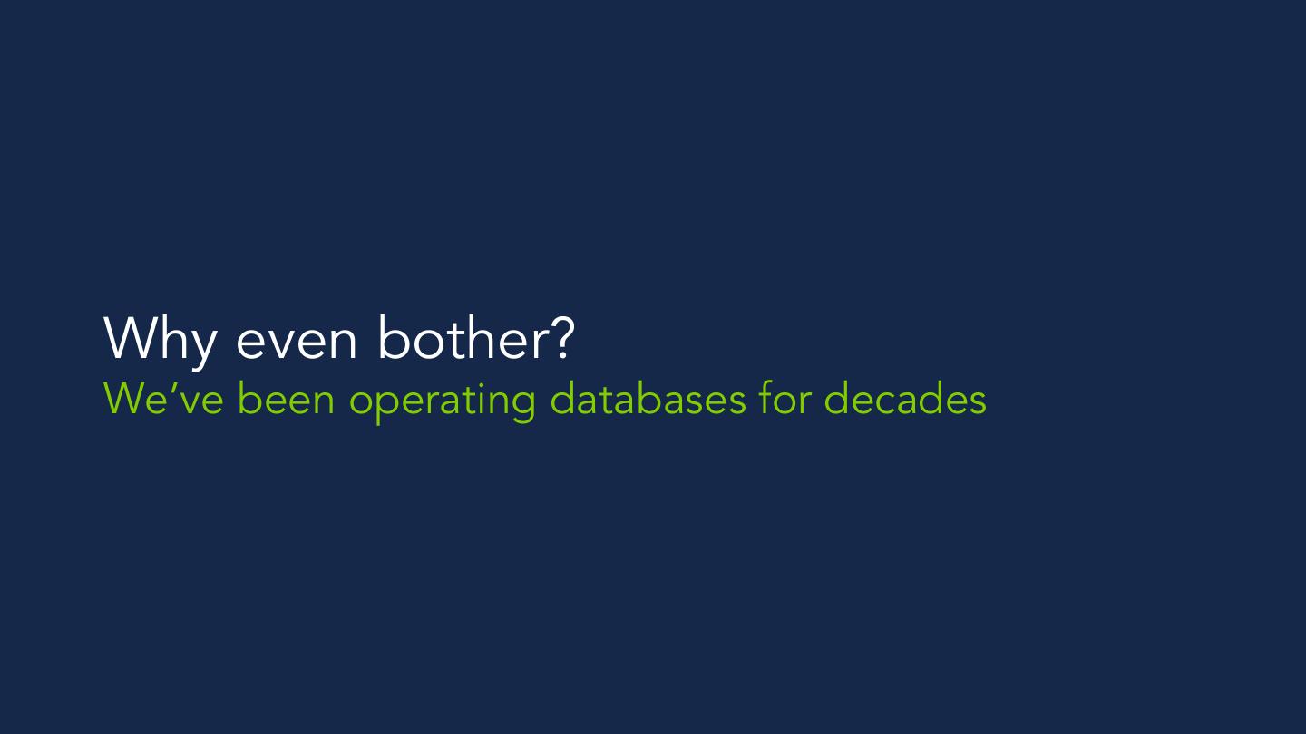 9 .Let’s talk about databases in Kubernetes • Why would you even want to run databases in Kubernetes? • What do databases need to run reliably? • What should you know about your orchestration system? • What’s likely to go wrong and what can you do about it?