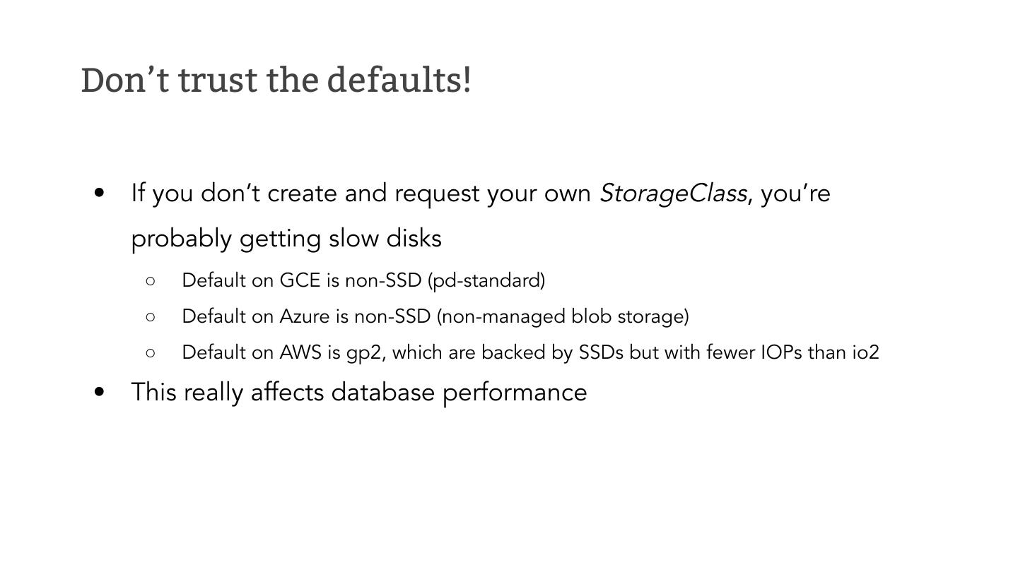 28 .Don’t trust the defaults! • If you don’t create and request your own StorageClass, you’re probably getting slow disks ○ Default on GCE is non-SSD (pd-standard) ○ Default on Azure is non-SSD (non-managed blob storage) ○ Default on AWS is gp2, which are backed by SSDs but with fewer IOPs than io2 • This really affects database performance