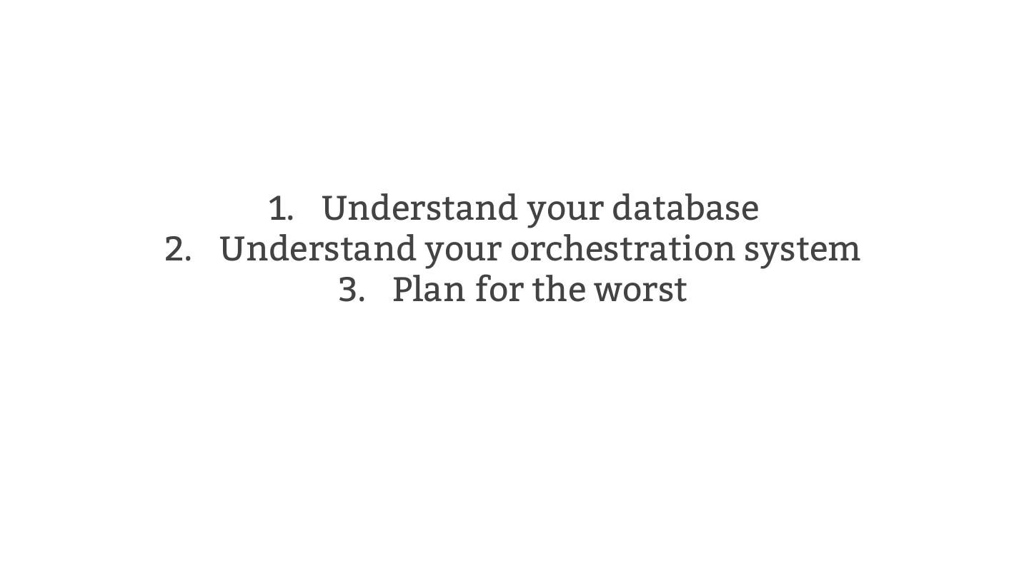 8 . To succeed, you must: 1. Understand your database 2. Understand your orchestration system 3. Plan for the worst