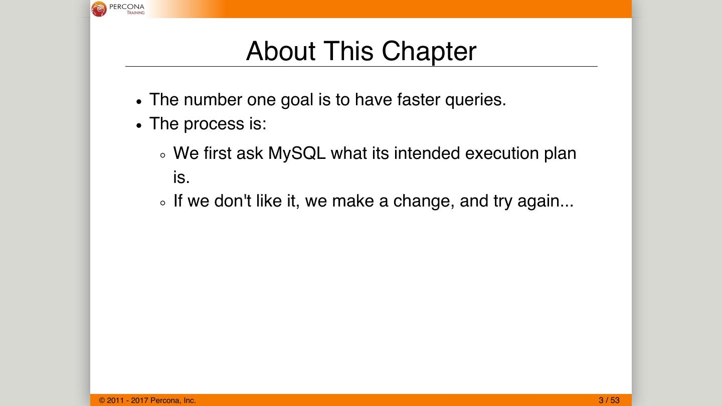 3 . About This Chapter The number one goal is to have faster queries. The process is: We first ask MySQL what its intended execution plan is. If we don't like it, we make a change, and try again... © 2011 - 2017 Percona, Inc. 3 / 53