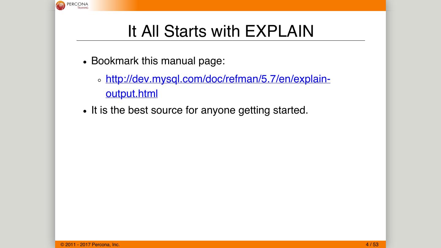 4 . It All Starts with EXPLAIN Bookmark this manual page: http://dev.mysql.com/doc/refman/5.7/en/explain- output.html It is the best source for anyone getting started. © 2011 - 2017 Percona, Inc. 4 / 53