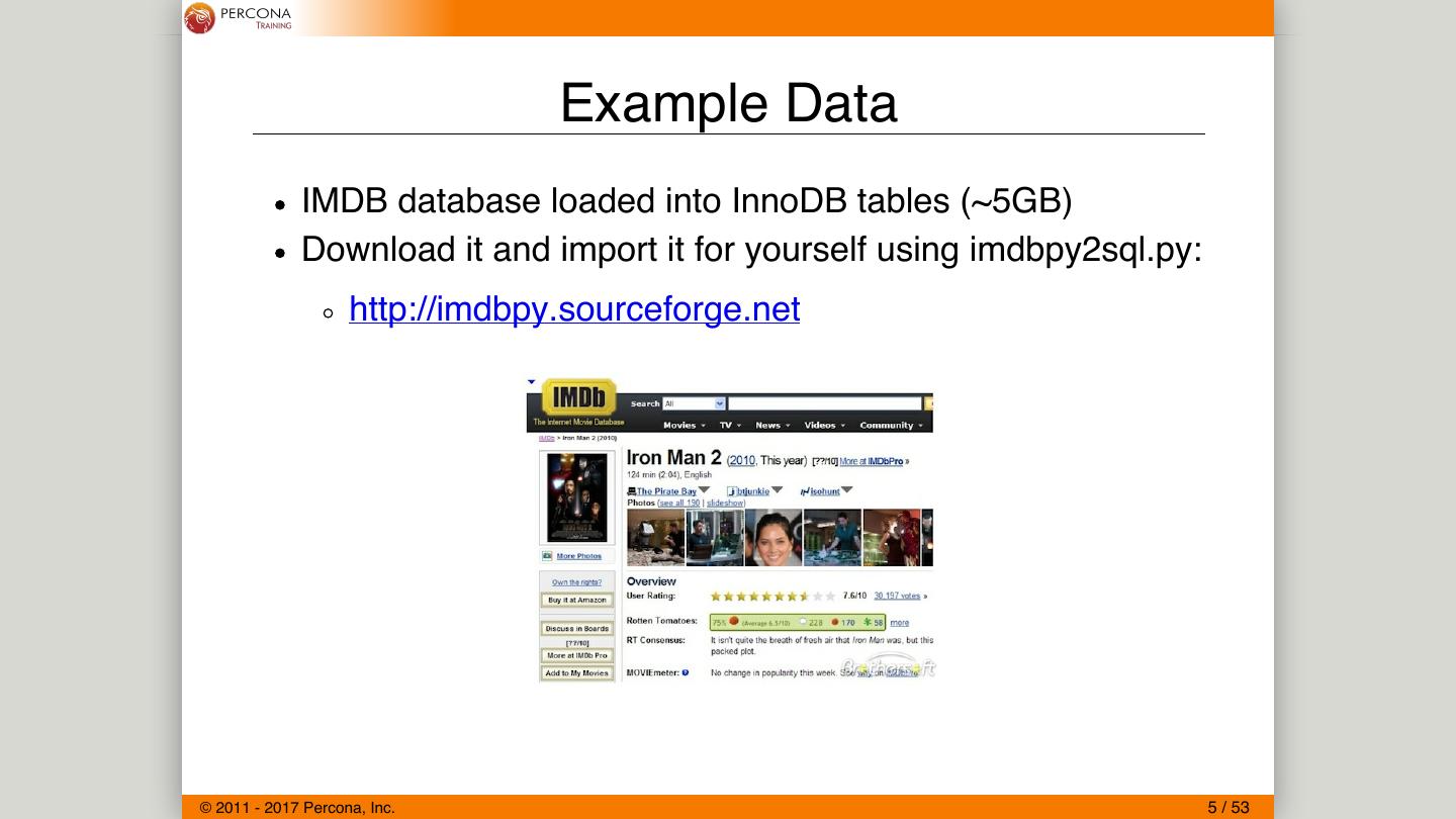 5 . Example Data IMDB database loaded into InnoDB tables (~5GB) Download it and import it for yourself using imdbpy2sql.py: http://imdbpy.sourceforge.net © 2011 - 2017 Percona, Inc. 5 / 53