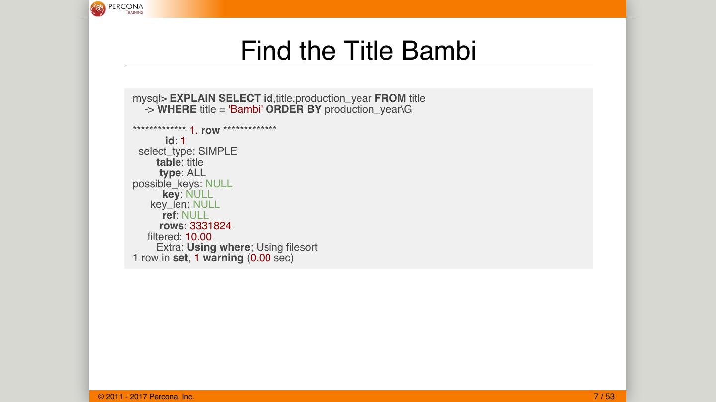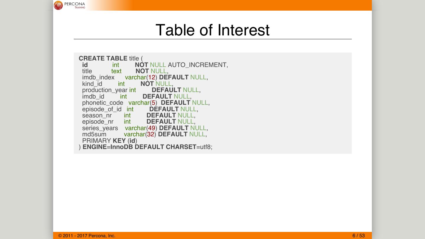 6 . Table of Interest CREATE TABLE title ( id int NOT NULL AUTO_INCREMENT, title text NOT NULL, imdb_index varchar(12) DEFAULT NULL, kind_id int NOT NULL, production_year int DEFAULT NULL, imdb_id int DEFAULT NULL, phonetic_code varchar(5) DEFAULT NULL, episode_of_id int DEFAULT NULL, season_nr int DEFAULT NULL, episode_nr int DEFAULT NULL, series_years varchar(49) DEFAULT NULL, md5sum varchar(32) DEFAULT NULL, PRIMARY KEY (id) ) ENGINE=InnoDB DEFAULT CHARSET=utf8; © 2011 - 2017 Percona, Inc. 6 / 53