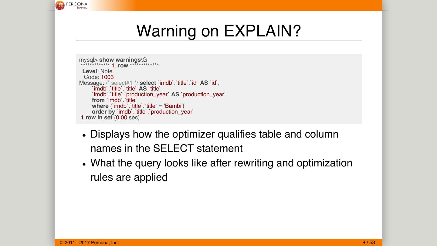 8 . Warning on EXPLAIN? mysql> show warnings\G ************* 1. row ************* Level: Note Code: 1003 Message: /* select#1 */ select `imdb`.`title`.`id` AS `id`, `imdb`.`title`.`title` AS `title`, `imdb`.`title`.`production_year` AS `production_year` from `imdb`.`title` where (`imdb`.`title`.`title` = 'Bambi') order by `imdb`.`title`.`production_year` 1 row in set (0.00 sec) Displays how the optimizer qualifies table and column names in the SELECT statement What the query looks like after rewriting and optimization rules are applied © 2011 - 2017 Percona, Inc. 8 / 53