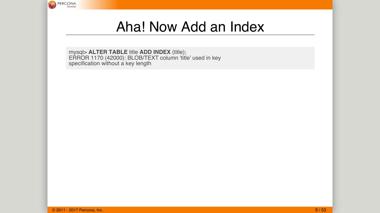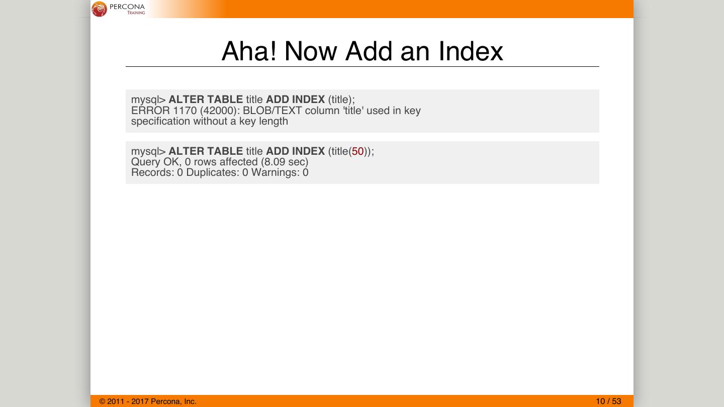 9 . Aha! Now Add an Index mysql> ALTER TABLE title ADD INDEX (title); ERROR 1170 (42000): BLOB/TEXT column 'title' used in key specification without a key length © 2011 - 2017 Percona, Inc. 9 / 53