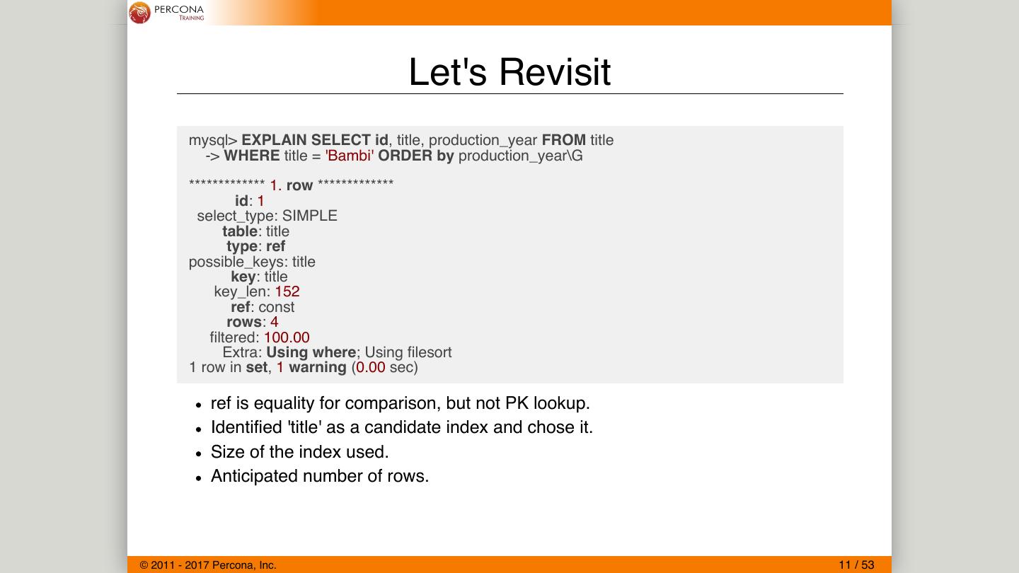 11 . Let's Revisit mysql> EXPLAIN SELECT id, title, production_year FROM title -> WHERE title = 'Bambi' ORDER by production_year\G ************* 1. row ************* id: 1 select_type: SIMPLE table: title type: ref possible_keys: title key: title key_len: 152 ref: const rows: 4 filtered: 100.00 Extra: Using where; Using filesort 1 row in set, 1 warning (0.00 sec) ref is equality for comparison, but not PK lookup. Identified 'title' as a candidate index and chose it. Size of the index used. Anticipated number of rows. © 2011 - 2017 Percona, Inc. 11 / 53