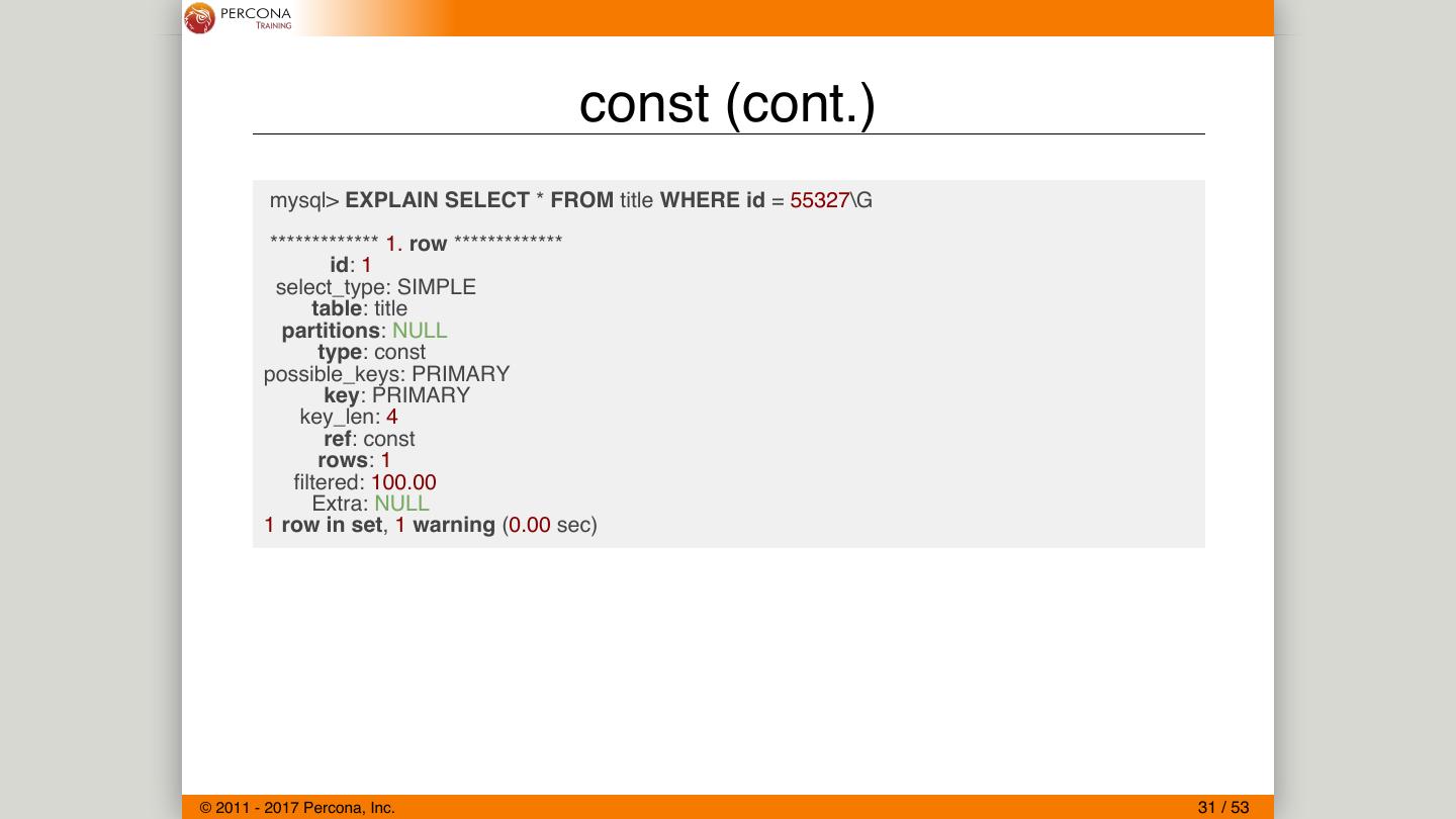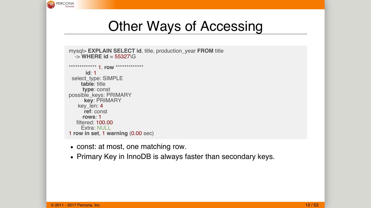 12 . Other Ways of Accessing mysql> EXPLAIN SELECT id, title, production_year FROM title -> WHERE id = 55327\G ************* 1. row ************* id: 1 select_type: SIMPLE table: title type: const possible_keys: PRIMARY key: PRIMARY key_len: 4 ref: const rows: 1 filtered: 100.00 Extra: NULL 1 row in set, 1 warning (0.00 sec) const: at most, one matching row. Primary Key in InnoDB is always faster than secondary keys. © 2011 - 2017 Percona, Inc. 12 / 53