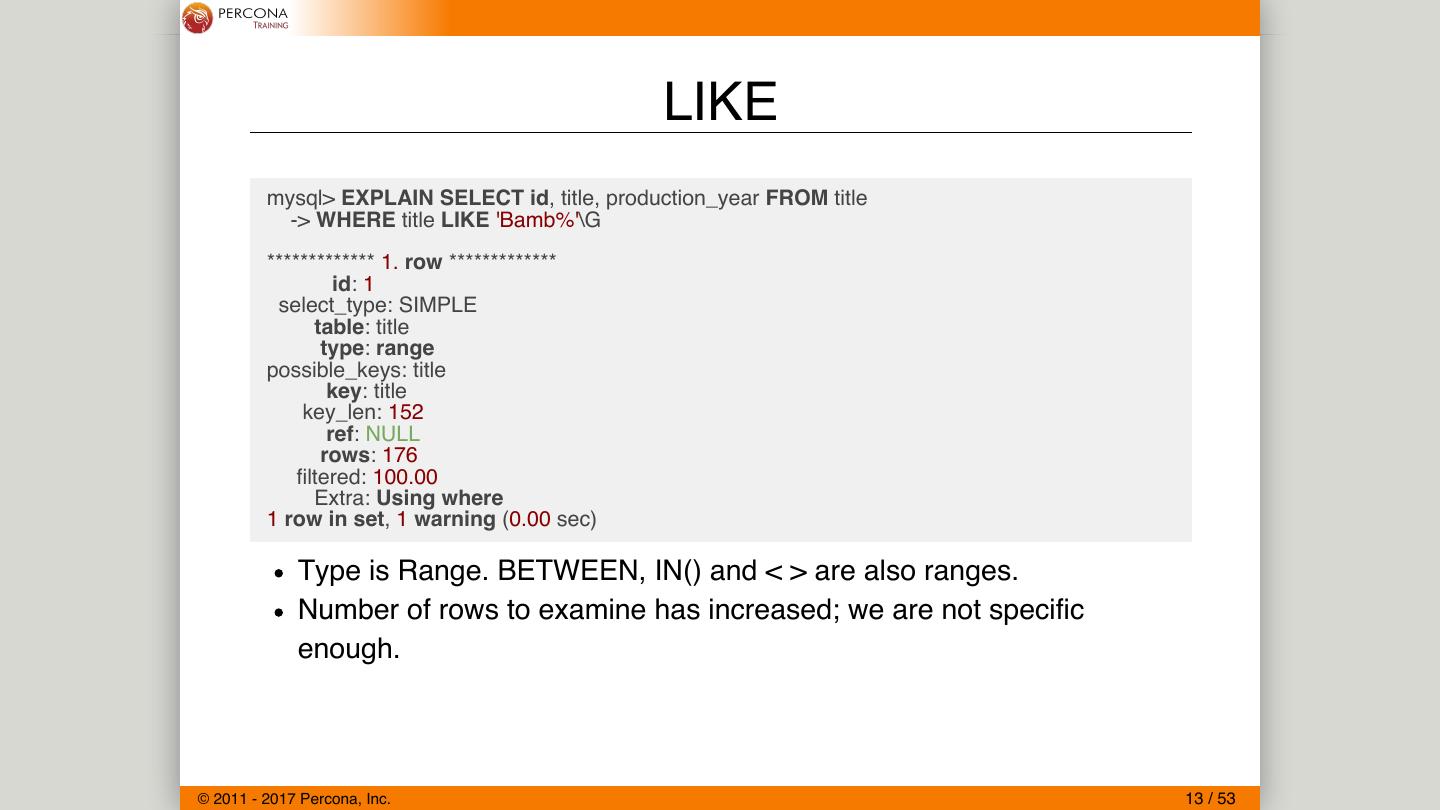 13 . LIKE mysql> EXPLAIN SELECT id, title, production_year FROM title -> WHERE title LIKE 'Bamb%'\G ************* 1. row ************* id: 1 select_type: SIMPLE table: title type: range possible_keys: title key: title key_len: 152 ref: NULL rows: 176 filtered: 100.00 Extra: Using where 1 row in set, 1 warning (0.00 sec) Type is Range. BETWEEN, IN() and < > are also ranges. Number of rows to examine has increased; we are not specific enough. © 2011 - 2017 Percona, Inc. 13 / 53