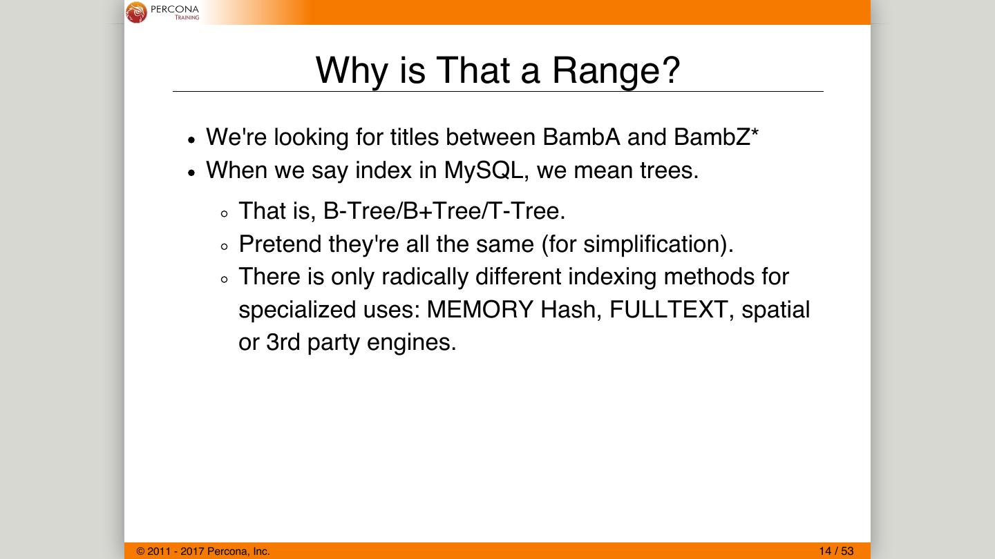 14 . Why is That a Range? We're looking for titles between BambA and BambZ* When we say index in MySQL, we mean trees. That is, B-Tree/B+Tree/T-Tree. Pretend they're all the same (for simplification). There is only radically different indexing methods for specialized uses: MEMORY Hash, FULLTEXT, spatial or 3rd party engines. © 2011 - 2017 Percona, Inc. 14 / 53