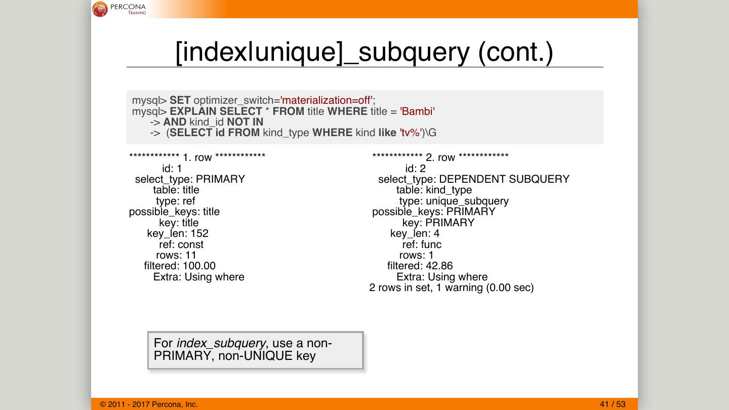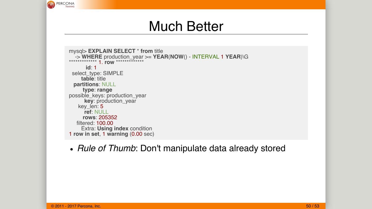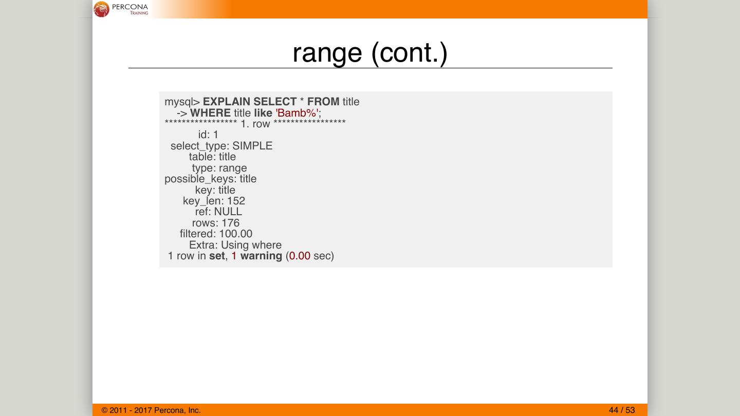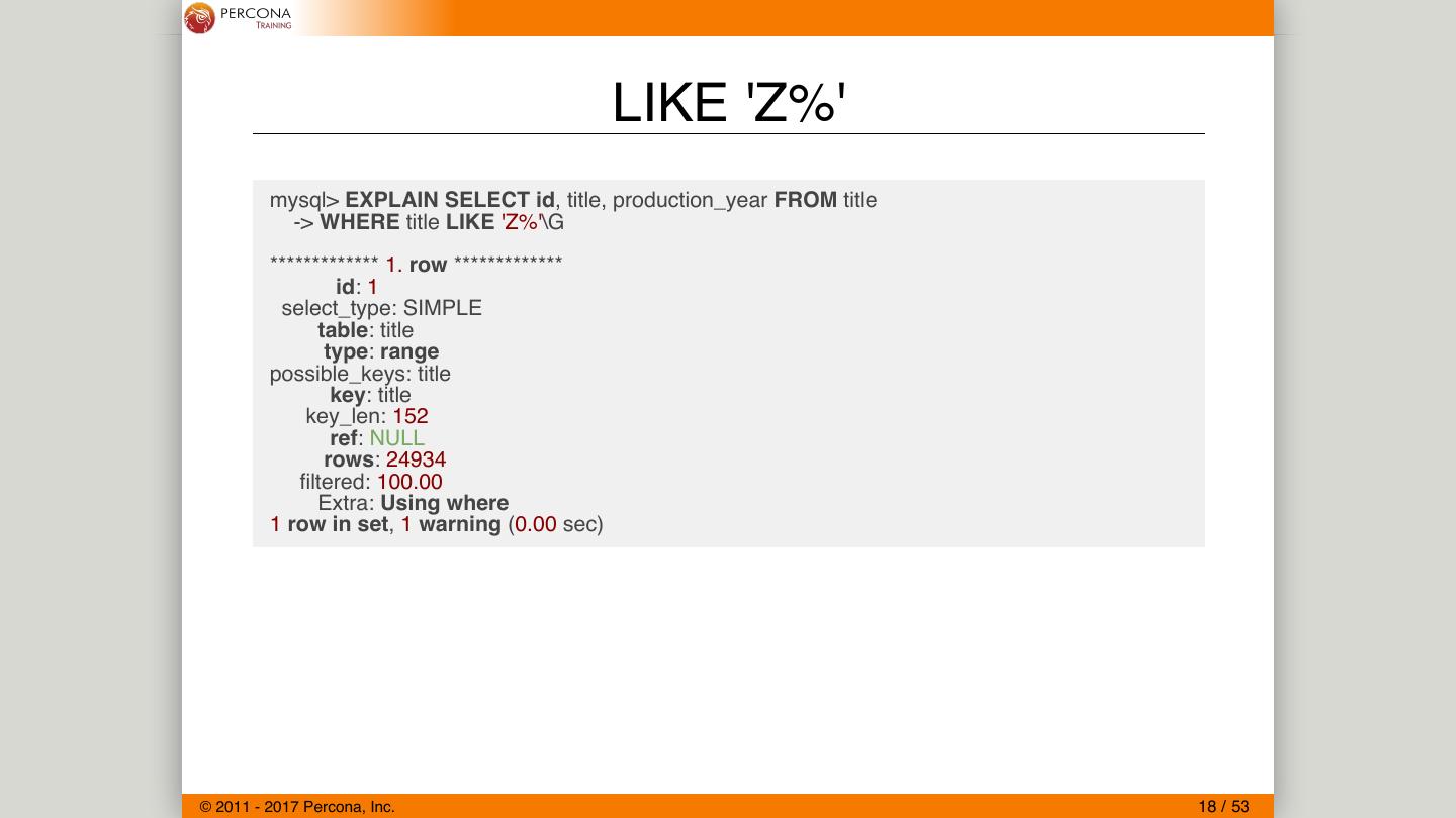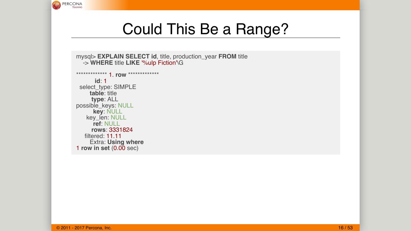 16 . Could This Be a Range? mysql> EXPLAIN SELECT id, title, production_year FROM title -> WHERE title LIKE '%ulp Fiction'\G ************* 1. row ************* id: 1 select_type: SIMPLE table: title type: ALL possible_keys: NULL key: NULL key_len: NULL ref: NULL rows: 3331824 filtered: 11.11 Extra: Using where 1 row in set (0.00 sec) © 2011 - 2017 Percona, Inc. 16 / 53