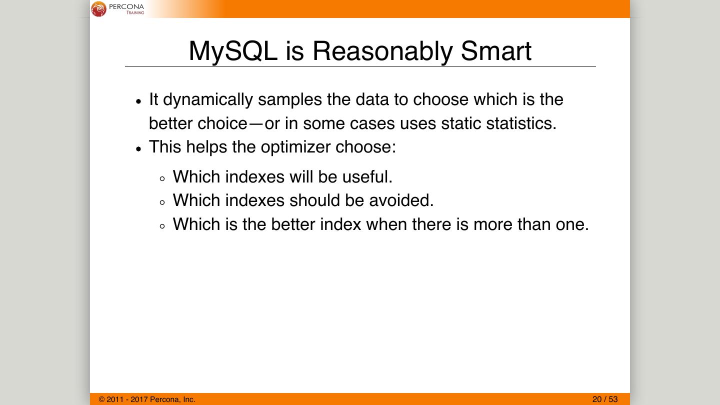 20 . MySQL is Reasonably Smart It dynamically samples the data to choose which is the better choice—or in some cases uses static statistics. This helps the optimizer choose: Which indexes will be useful. Which indexes should be avoided. Which is the better index when there is more than one. © 2011 - 2017 Percona, Inc. 20 / 53
