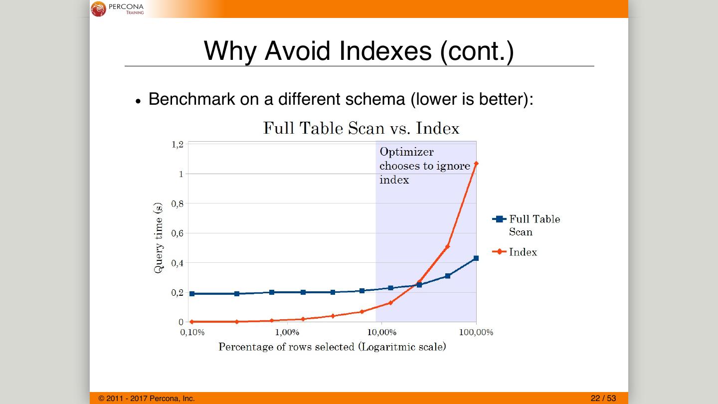 21 . Why Avoid Indexes? B-Trees work like humans search a phone book; Use an index if you want just a few rows. Scan cover-to-cover if you want a large percentage. © 2011 - 2017 Percona, Inc. 21 / 53