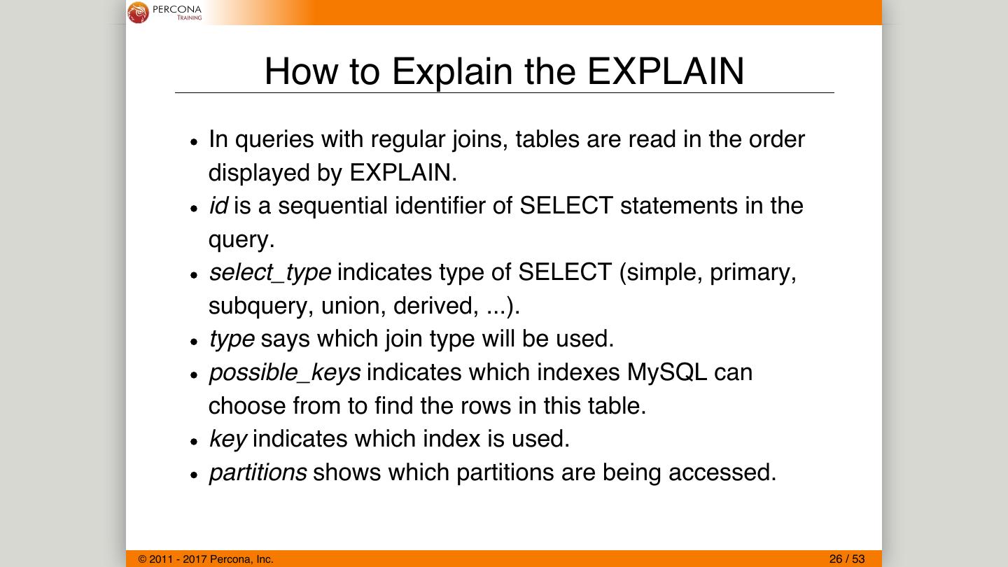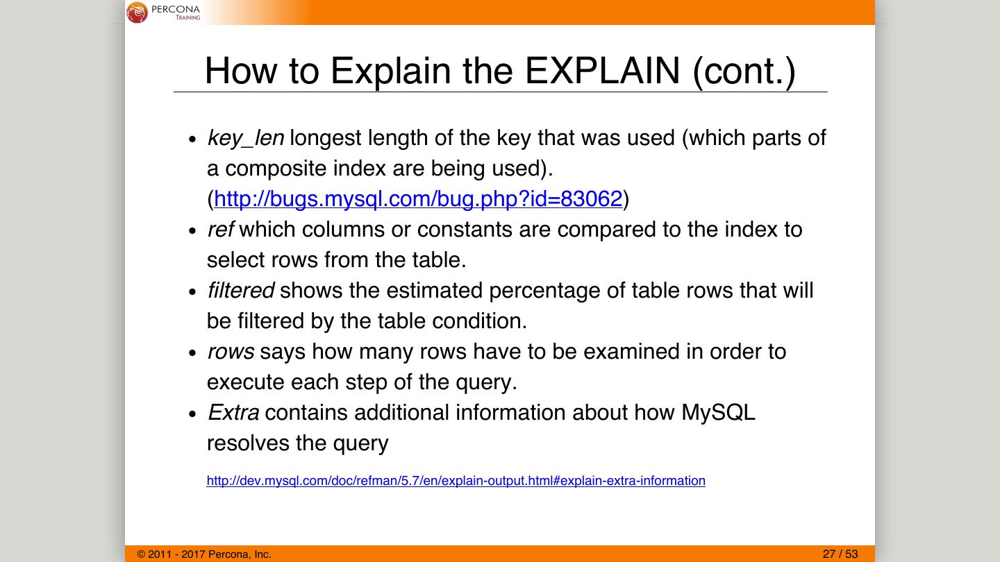 26 . How to Explain the EXPLAIN In queries with regular joins, tables are read in the order displayed by EXPLAIN. id is a sequential identifier of SELECT statements in the query. select_type indicates type of SELECT (simple, primary, subquery, union, derived, ...). type says which join type will be used. possible_keys indicates which indexes MySQL can choose from to find the rows in this table. key indicates which index is used. partitions shows which partitions are being accessed. © 2011 - 2017 Percona, Inc. 26 / 53
