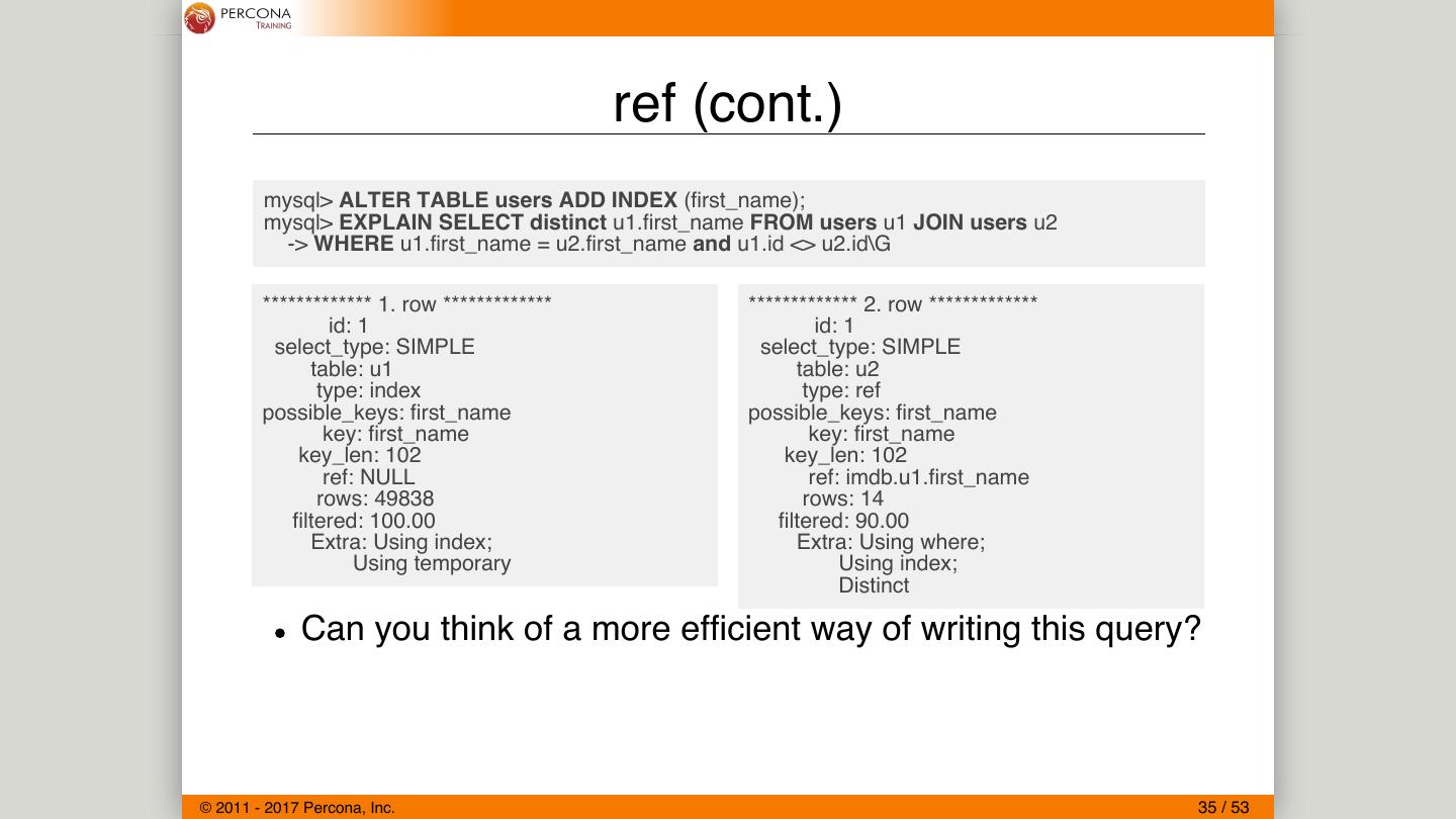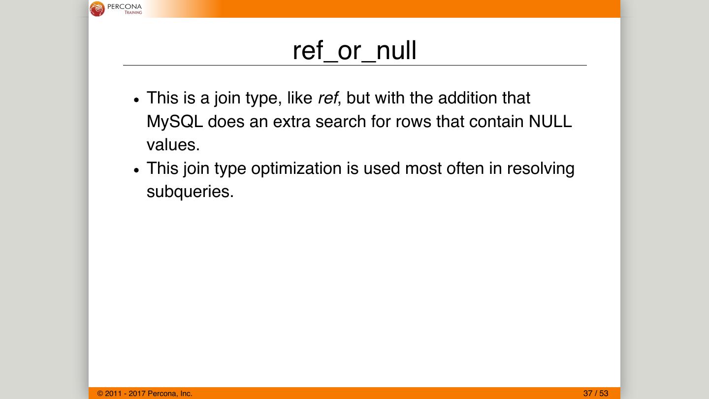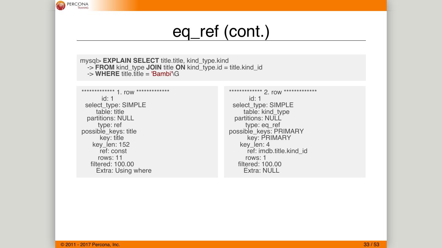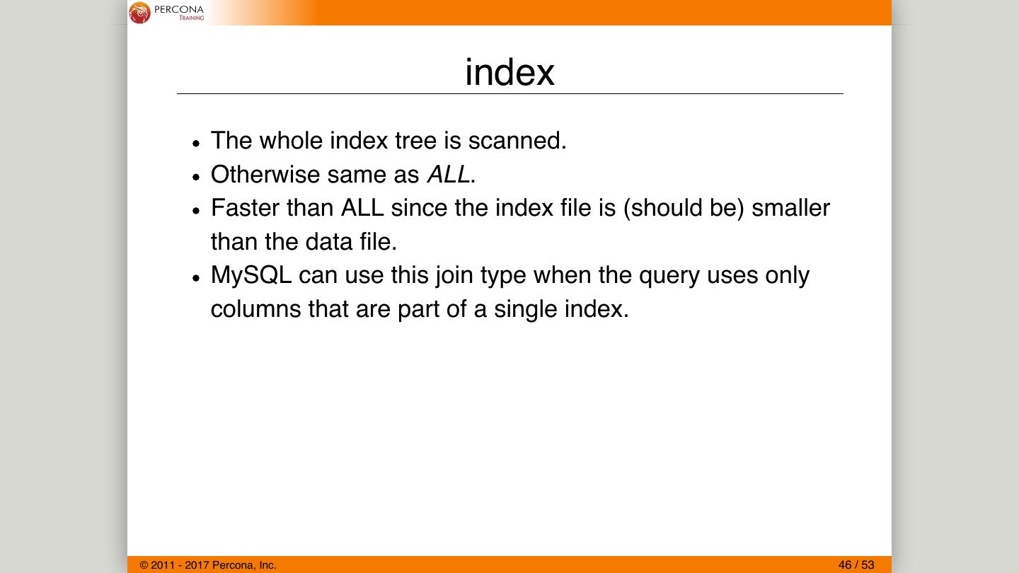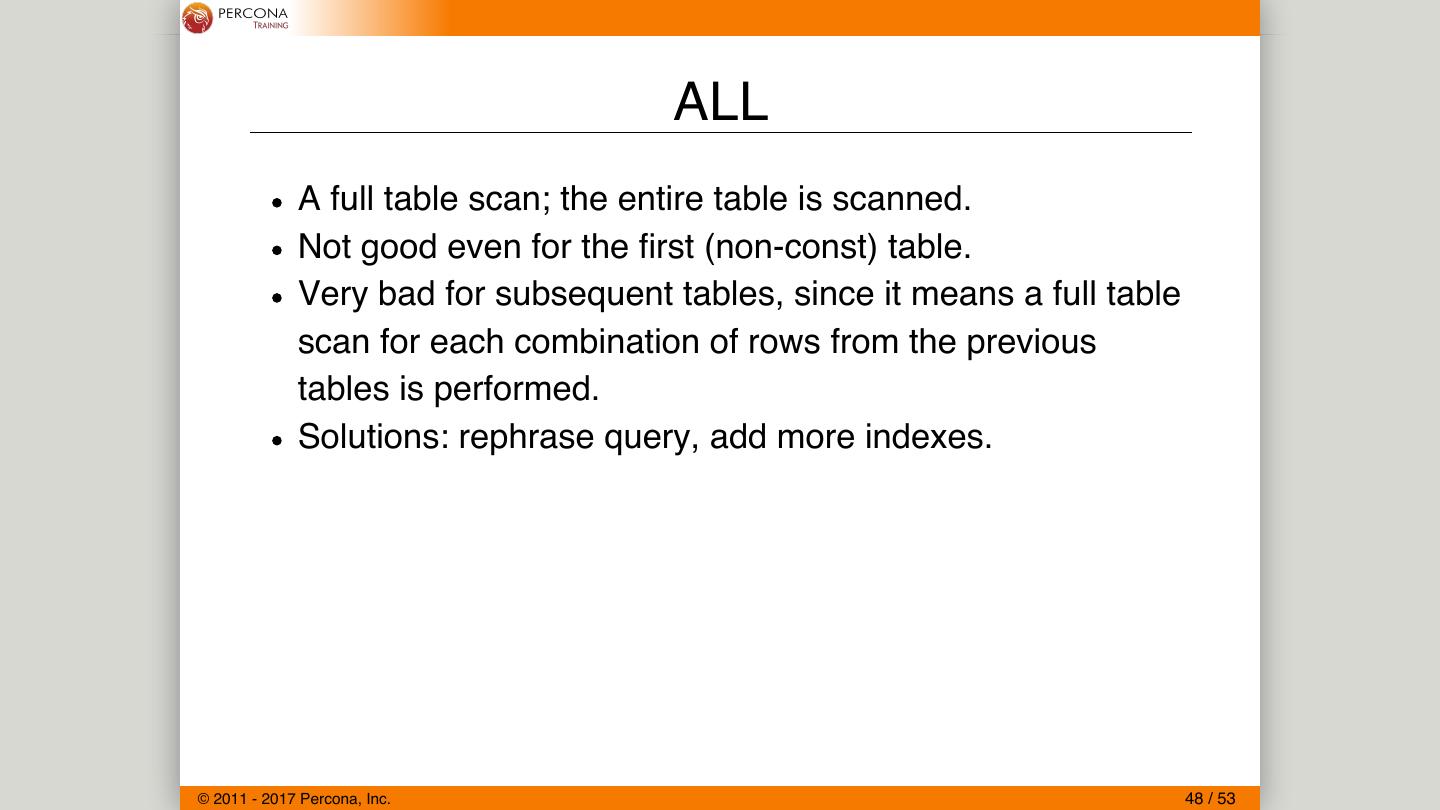 28 . Types in EXPLAIN The following slides show possible values for EXPLAIN type, ordered (approximately) from the fastest to the slowest. FULLTEXT access type (and its special indexes) are not covered on this section. © 2011 - 2017 Percona, Inc. 28 / 53