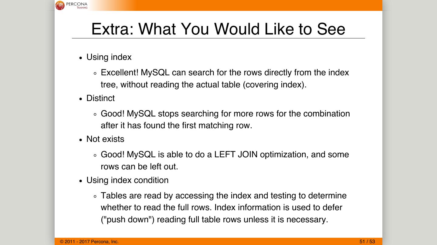 25 . Indexes - Need to Know EXPLAINING THE EXPLAIN © 2011 - 2017 Percona, Inc. 25 / 53