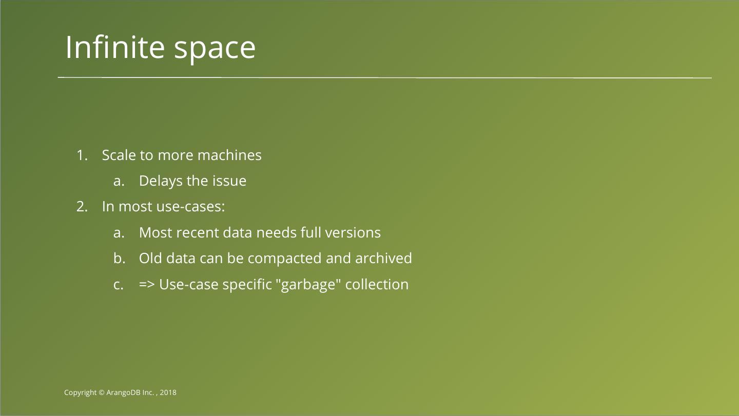 13 .Infinite space 1. Scale to more machines a. Delays the issue 2. In most use-cases: a. Most recent data needs full versions b. Old data can be compacted and archived c. => Use-case specific "garbage" collection Copyright © ArangoDB Inc. , 2018