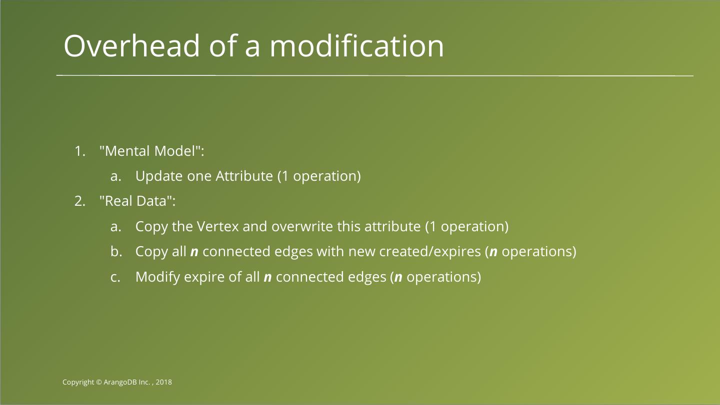 14 .Overhead of a modification 1. "Mental Model": a. Update one Attribute (1 operation) 2. "Real Data": a. Copy the Vertex and overwrite this attribute (1 operation) b. Copy all n connected edges with new created/expires (n operations) c. Modify expire of all n connected edges (n operations) Copyright © ArangoDB Inc. , 2018