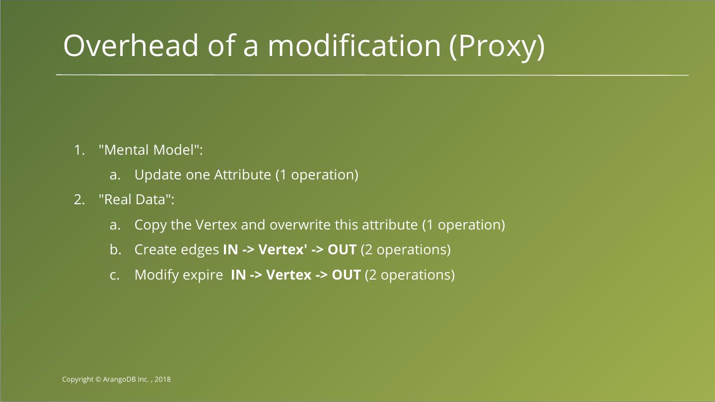 18 .Overhead of a modification (Proxy) 1. "Mental Model": a. Update one Attribute (1 operation) 2. "Real Data": a. Copy the Vertex and overwrite this attribute (1 operation) b. Create edges IN -> Vertex' -> OUT (2 operations) c. Modify expire IN -> Vertex -> OUT (2 operations) Copyright © ArangoDB Inc. , 2018
