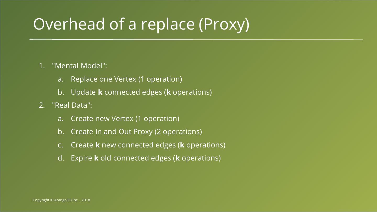 20 .Overhead of a replace (Proxy) 1. "Mental Model": a. Replace one Vertex (1 operation) b. Update k connected edges (k operations) 2. "Real Data": a. Create new Vertex (1 operation) b. Create In and Out Proxy (2 operations) c. Create k new connected edges (k operations) d. Expire k old connected edges (k operations) Copyright © ArangoDB Inc. , 2018