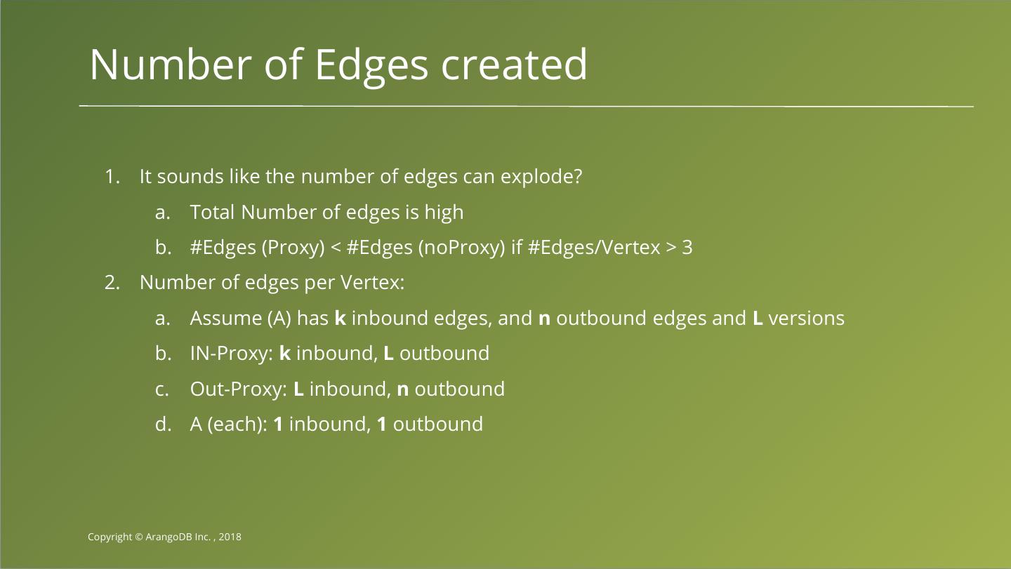 22 .Number of Edges created 1. It sounds like the number of edges can explode? a. Total Number of edges is high b. #Edges (Proxy) < #Edges (noProxy) if #Edges/Vertex > 3 2. Number of edges per Vertex: a. Assume (A) has k inbound edges, and n outbound edges and L versions b. IN-Proxy: k inbound, L outbound c. Out-Proxy: L inbound, n outbound d. A (each): 1 inbound, 1 outbound Copyright © ArangoDB Inc. , 2018