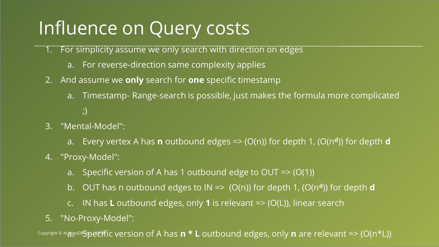 23 .Influence on Query costs 1. For simplicity assume we only search with direction on edges a. For reverse-direction same complexity applies 2. And assume we only search for one specific timestamp a. Timestamp- Range-search is possible, just makes the formula more complicated ;) 3. "Mental-Model": a. Every vertex A has n outbound edges => (O(n)) for depth 1, (O(nd)) for depth d 4. "Proxy-Model": a. Specific version of A has 1 outbound edge to OUT => (O(1)) b. OUT has n outbound edges to IN => (O(n)) for depth 1, (O(n d)) for depth d c. IN has L outbound edges, only 1 is relevant => (O(L)), linear search 5. "No-Proxy-Model": a. Specific version of A has n * L outbound edges, only n are relevant => (O(n*L)) Copyright © ArangoDB Inc. , 2018