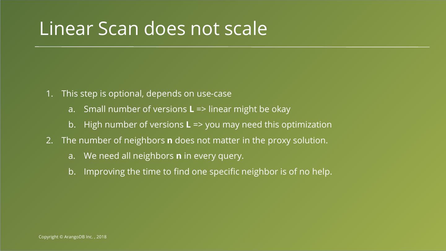 25 .Linear Scan does not scale 1. This step is optional, depends on use-case a. Small number of versions L => linear might be okay b. High number of versions L => you may need this optimization 2. The number of neighbors n does not matter in the proxy solution. a. We need all neighbors n in every query. b. Improving the time to find one specific neighbor is of no help. Copyright © ArangoDB Inc. , 2018