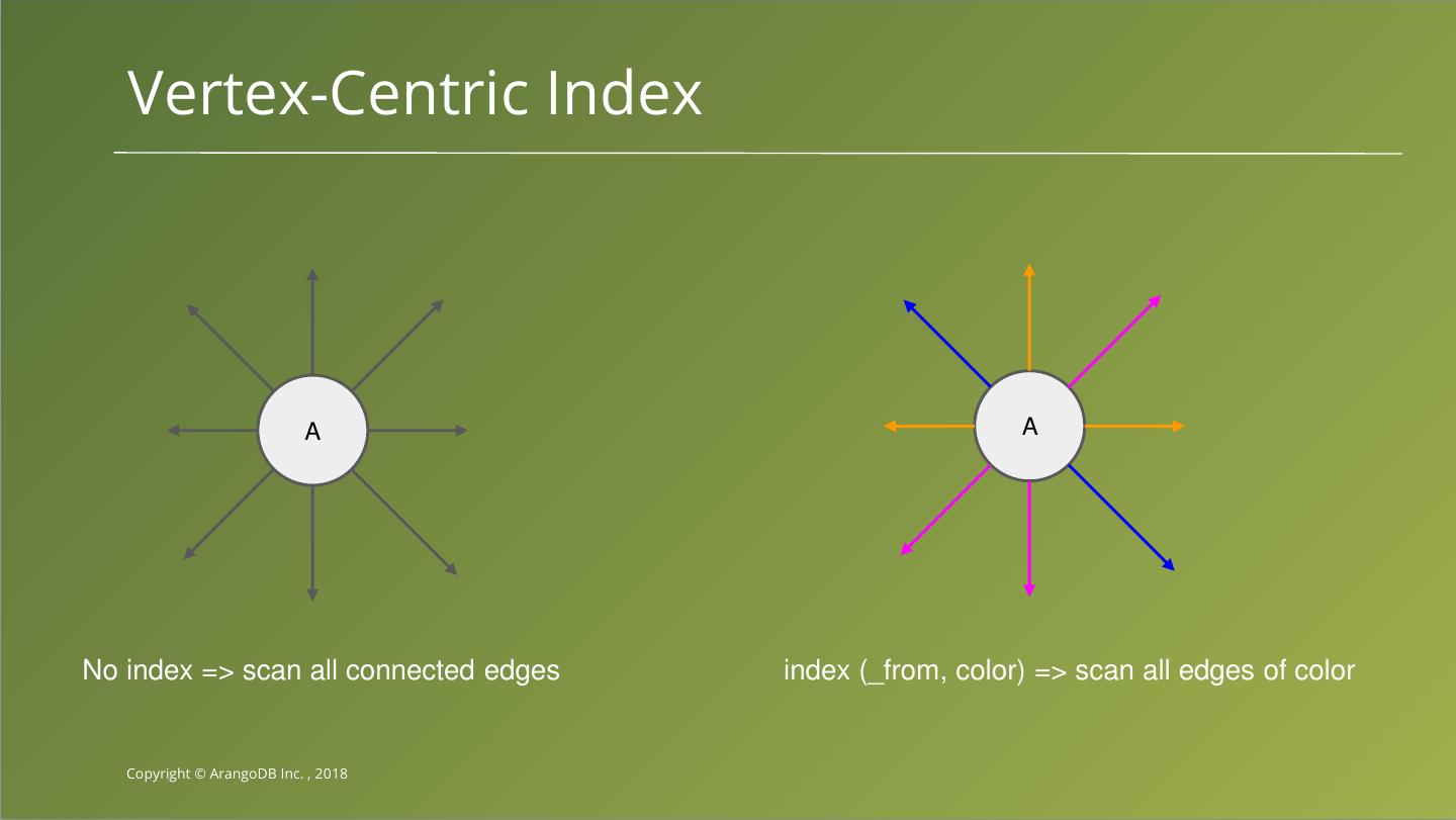 26 . Vertex-Centric Index A A No index => scan all connected edges index (_from, color) => scan all edges of color Copyright © ArangoDB Inc. , 2018