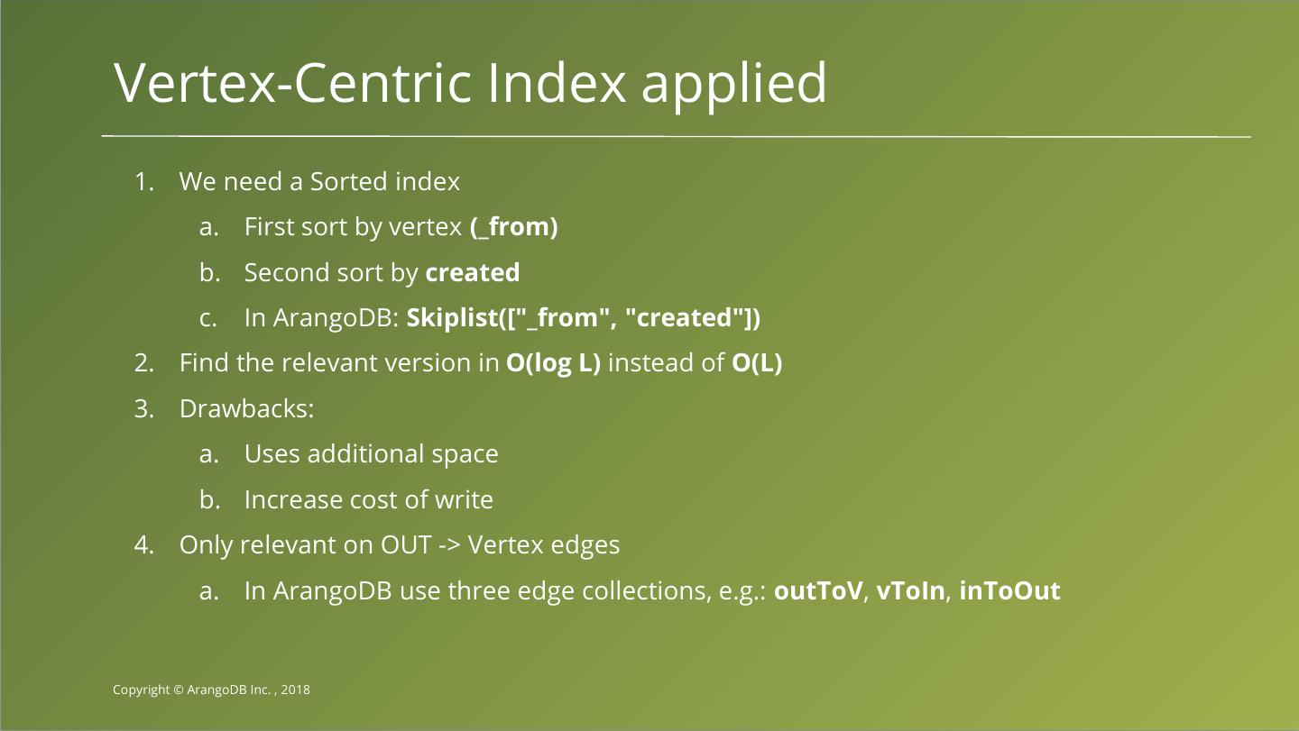 27 .Vertex-Centric Index applied 1. We need a Sorted index a. First sort by vertex (_from) b. Second sort by created c. In ArangoDB: Skiplist(["_from", "created"]) 2. Find the relevant version in O(log L) instead of O(L) 3. Drawbacks: a. Uses additional space b. Increase cost of write 4. Only relevant on OUT -> Vertex edges a. In ArangoDB use three edge collections, e.g.: outToV, vToIn, inToOut Copyright © ArangoDB Inc. , 2018